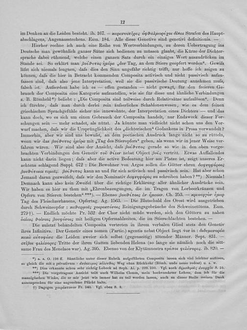 Hierher rechne ich auch eine Reihe von Wortverbindungen, zu deren Uebertragung ins Deutsche man gewöhnlich ganzer Sätze sich bedienen zu müssen glaubt, die Kürze der Dichter- sprache dabei rühmend, welche einen ganzen Satz durch ein einziges Wort auszudrücken im Stande sei. So erklärt man Sονενιννιπιοσ*m10ιιαα„der Tag, an dem Stiere geopfert werden“. Gewils läſst sich niemals leugnen, daſs dies den Sinn ungefähr richtig trifft, nur hoffe ich zeigen zu können, daſs die hier in Betracht kommenden Composita activisch und nicht passivisch aufzu- fassen sind, daſs also jene Interpretation, weil sie die passivische Deutung annehmen muls, falsch ist. Aufserdem habe ich es— offen gestanden— nicht gewagt, für den freieren Ge- brauch der Composita eine Kategorie aufzustellen, wie sie für diese und ähnliche Verbindungen z. B. Römheld*) beliebt:„Die Composita sind teilweise durch Relativsätze aufzulösen“. Denn ich fürchte, daſs man durch derlei rein äufserliches Schablonenwesen, wie es dem feinen griechischen Sprachgefühle sicher nie innewohnte, der Interpretation eines Dichters— und das kann doch, wo es sich um einen Gebrauch der Composita handelt, nur Endzweck dieser For- schungen sein— mehr schadet, als nützt. Ja könnte man vielleicht nicht schon uns den Vor- wurf machen, daſs wir die Ursprünglichkeit des„dichterischen“ Gedankens in Prosa verwandelt? Immerhin, aber wir sind uns bewulſst, an dem poetischen Ausdruck lange nicht so zu rütteln, wenn wir das g009 TO 7l⁵εοα mit„Tag des Stieropfers“ geben, als wenn wir in jener Weise ver- fahren wären. Wir sind also der Ansicht, daſs 8oı*νos gerade so wie in den oben vorge- brachten Verbindungen den Genetiv 1⁰5 dlεuν nebst Object gote vertritt. Etwas Auffallendes kann nicht darin liegen; daſs aber die active Bedeutung hier am Platze ist, zeigt unseres Er- achtens schlagend Suppl. 672: Die Bewohner von Argos sollen die Götter ehren d⁴αααννρσαοις 9⁰ ντN rMls. 9⁰1rog kann an und für sich activisch und passivisch sein. Hat aber schon Jemand daran gezweifelt, dals wir den Nominativ dσνςσοοε zu schreiben haben?**) Niemals! Demnach kann also kein Zweifel über die richtige Erklärung aller ähnlicher Ausdrücke sein. Wir haben es hier zu thun mit„Ehrenbezeugungen, die im Tragen von Lorbeerkränzen und Opfern von Stieren bestehen“***).— Ebenso 90ιτοσι εν τm⁴μααοαυν Ch. 253.— 2000 1Mα Tag des Fleischzerhauens, Opfertag. Ag. 1563.— Die Blutschuld des Orest wird ausgetrieben durch Schweineopfer: 2ᷣ᷑νιαιο⁵ς τοαοατνυοα Reinigungsgebräuche des Schweinetötens. Eum. 279 †).— Endlich möchte Pr. 532 der Chor nicht müde werden, sich den Göttern zu nahen 61lςα mσισυσασι ισνοοςα mit heiligen Opfermahlzeiten, die im Stierschlachten bestehen.—