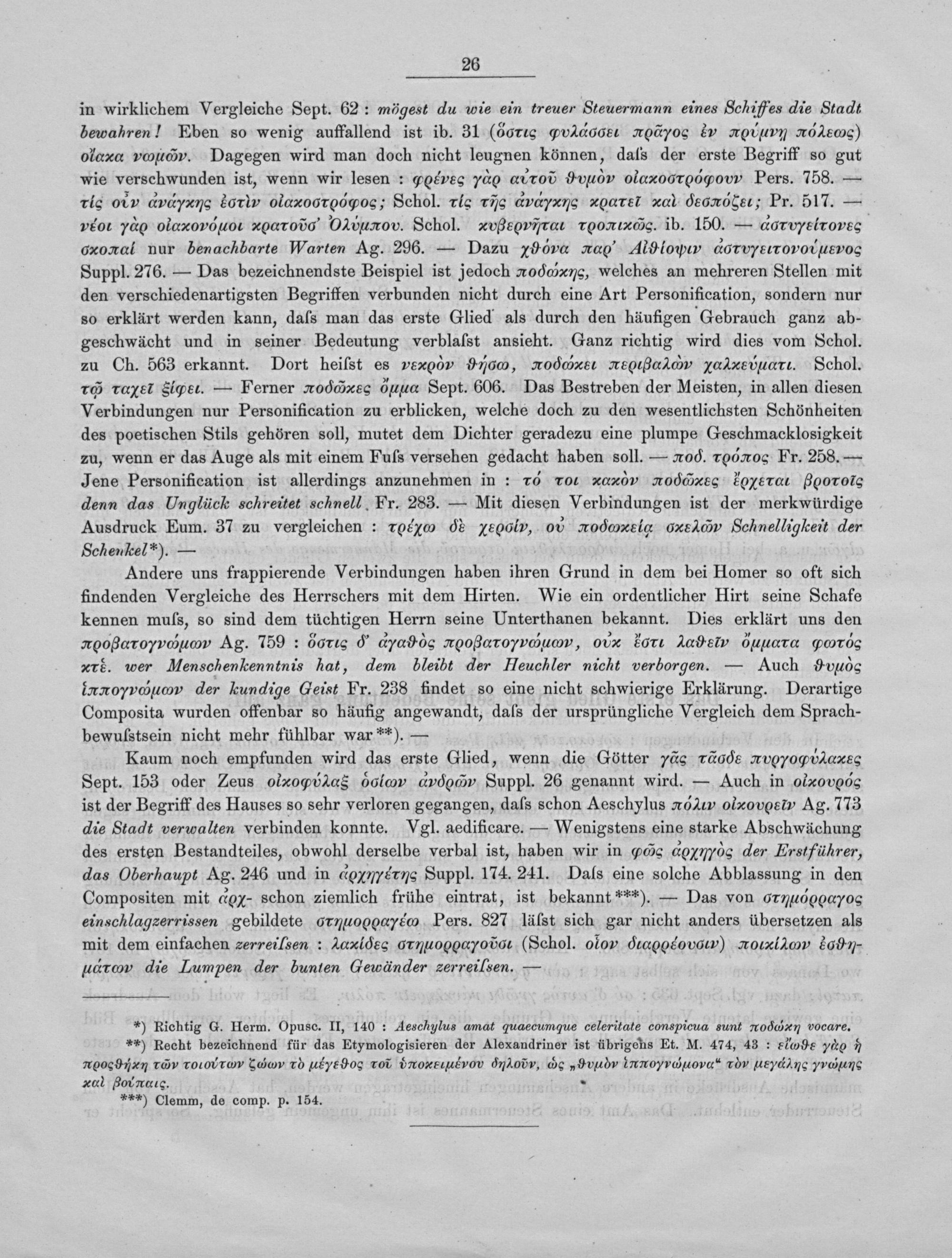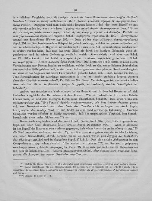 in wirklichem Vergleiche Sept. 62: mögest du wie ein treuer Steuermann eines Schiffes die Stadt bewahren! Eben so wenig auffallend ist ib. 31(dG&σο½ᷣααςειι—ᷣκοωmνο ενν αοωιιηυmπ¶ mμυιεισσςσ olaxa vuι⁵ιαν„ Dagegen wird man doch nicht leugnen können, daſs der erste Begriff so gut wie verschwunden ist, wenn wir lesen: œotves vdο αντοο ϑμαν olaoοοςοw Pers. 758.— rls otν dedyννς εoοuν olaxoοοςσοςα; Schol. rle rijc dvdyα orel al deeσκεεε, Pr. 517.— vEot yο olaxoνοι τραααιοοοο υeϋαοωο. Schol. νρμνερονντα παέ. ib. 150.— dorvyelrovss oxoxal nur benachbarte Warten Ag. 296.— Dazu xνvα ταα οlOνꝓνν dοτvεετονονιιυνεκνοοσ Suppl. 276.— Das bezeichnendste Beispiel ist jedoch πσυσαeφ, welches an mehreren Stellen mit den verschiedenartigsten Begriffen verbunden nicht durch eine Art Personification, sondern nur so erklärt werden kann, daſs man das erste Glied als durch den häufigen Gebrauch ganz ab- geschwächt und in seiner Bedeutung verblaſst ansieht. Ganz richtig wird dies vom Schol. zu Ch. 563 erkannt. Dort heiſst es vexν ϑ⁶, oddxαet eOαάαν αενμα. Schol. rcf( raxet Siger.— Ferner xο⁴ιρακνς ⁶ρμιμαα Sept. 606. Das Bestreben der Meisten, in allen diesen Verbindungen nur Personification zu erblicken, welche doch zu den wesentlichsten Schönheiten des poetischen Stils gehören soll, mutet dem Dichter geradezu eine plumpe Geschmacklosigkeit zu, wenn er das Auge als mit einem Fuſs versehen gedacht haben soll.—. rlασοα Fr. 258.— Jene Personification ist allerdings anzunehmen in: x6 rο ταm|ν αοαᷣαᷣ LOεrator 0010G denn das Unglück schreitet schnell Fr. 283.— Mit diesen Verbindungen ist der merkwürdige Ausdruck Eum. 37 zu vergleichen: rοε&⁴☛άρ ε εν d odωναά⅔te.ς xαένν Schnelligkeit der Schenkcel*).—