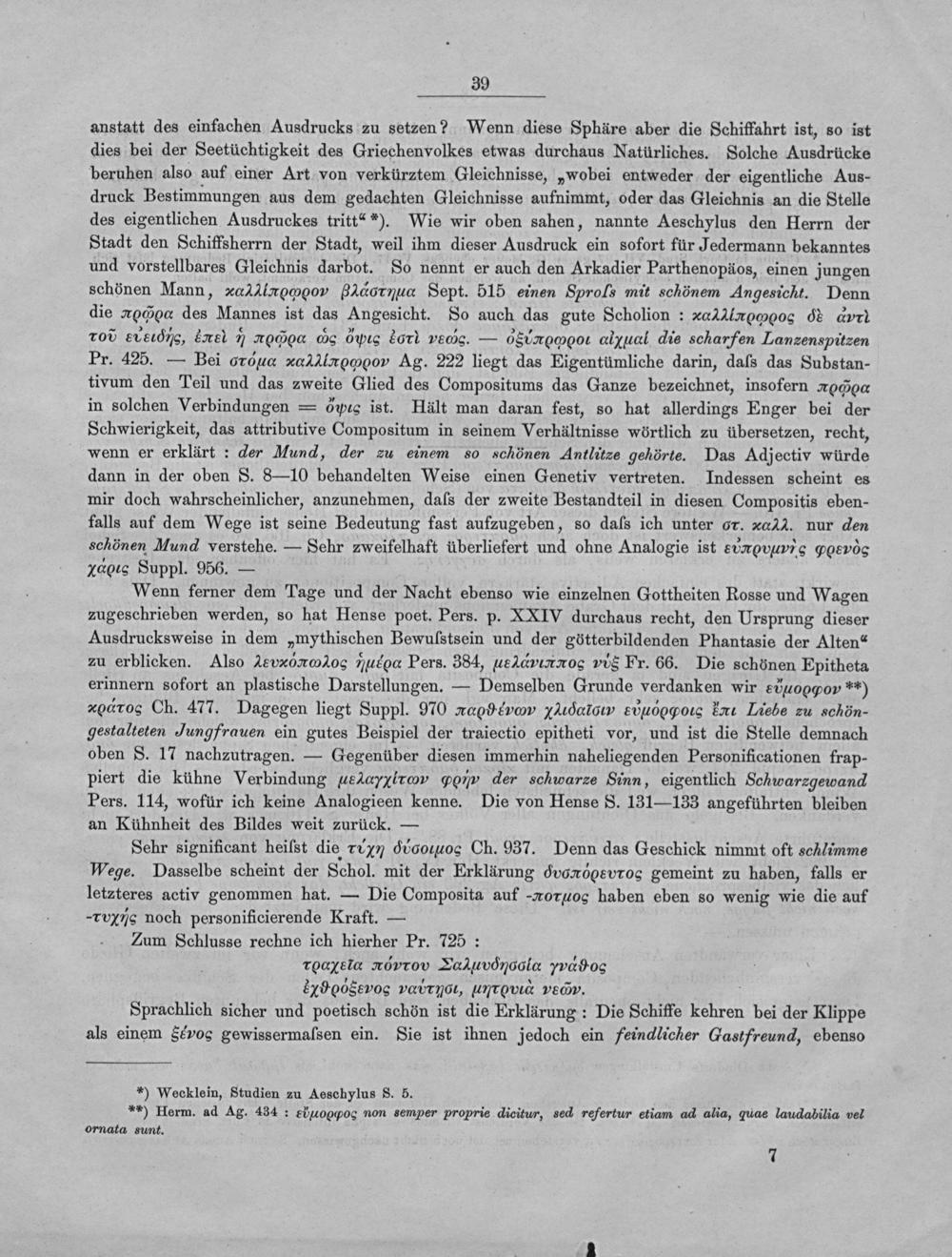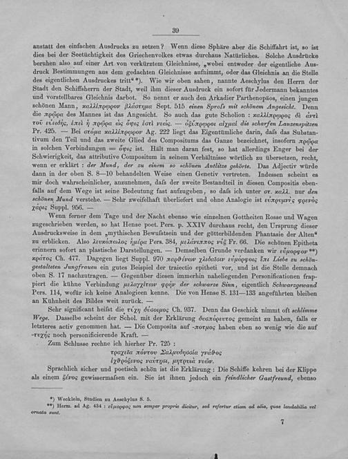 Wenn ferner dem Tage und der Nacht ebenso wie einzelnen Gottheiten Rosse und Wagen zugeschrieben werden, so hat Hense poet. Pers. p. XXIV qurchaus recht, den Ursprung dieser Ausdrucksweise in dem„mythischen Bewuſstsein und der götterbildenden Phantasie der Alten“ zu erblicken. Also 2eνᷣeναοs*έοαα Pers. 384, uε*⁴ανοεmσαοs vis Fr. 66. Die schönen Epitheta erinnern sofort an plastische Darstellungen.— Demselben Grunde verdanken wir uννρνι*ε) xoαο Ch. 477. Dagegen liegt Suppl. 970*ασρέωυασασνν τπι2α⁴̃οιν ειιμ⁵οσοςα eαπι Liebe zu schöno gestalteten Jungfrauen ein gutes Beispiel der traiectio epitheti vor, und ist die Stelle demnach oben S. 17 nachzutragen.— Gegenüber diesen immerhin naheliegenden Personificationen frap- piert die kühne Verbindung àeεαν‿εν σοπmν der schwarze Sinn, eigentlich Schuarzgewand Pers. 114, wofür ich keine Analogieen kenne. Die von Hense S. 131—133 angeführten bleiben an Kühnheit des Bildes weit zurück.—