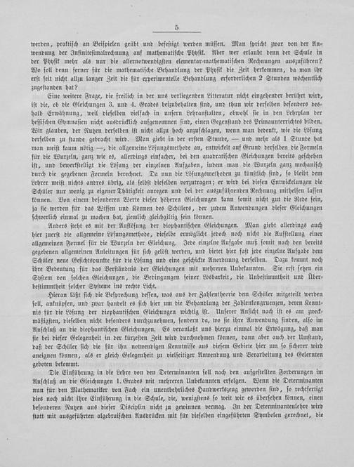 Die Einführung in die Lehre von den Determinanten ſoll nach den aufgeſtellten Forderungen im Anſchluß an die Gleichungen 1. Grades mit mehreren Unbekannten erfolgen. Wenn die Determinanten nun für den Mathematiker von Fach ein unentbehrliches Handwerkszeug geworden ſind, ſo rechtfertigt dies noch nicht ihre Einführung in die Schule, die, wenigſtens ſo weit wir es überſehen können, einen beſonderen Nutzen aus dieſer Disciplin nicht zu gewinnen vermag. In der Determinantenlehre wird ſtatt mit ausgeführten algebraiſchen Ausdrücken mit für dieſelben eingeführten Symbolen gerechnet, die