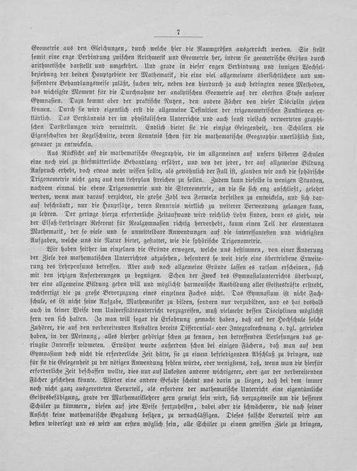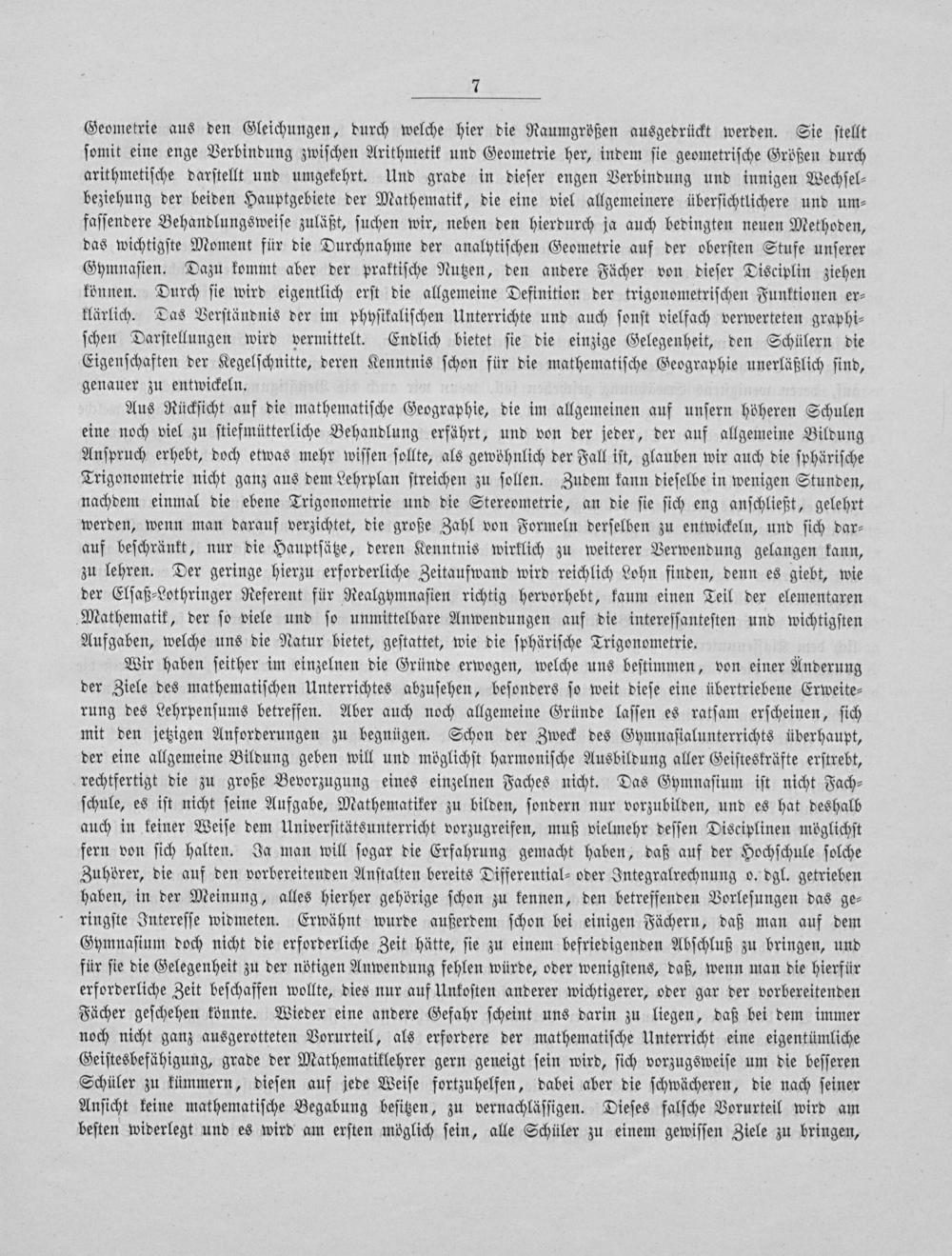 Aus Rückſicht auf die mathematiſche Geographie, die im allgemeinen auf unſern höheren Schulen eine noch viel zu ſtiefmütterliche Behandlung erfährt, und von der jeder, der auf allgemeine Bildung Anſpruch erhebt, doch etwas mehr wiſſen ſollte, als gewöhnlich der Fall iſt, glauben wir auch die ſphäriſche Trigonometrie nicht ganz aus dem Lehrplan ſtreichen zu ſollen. Zudem kann dieſelbe in wenigen Stunden, nachdem einmal die ebene Trigonometrie und die Stereometrie, an die ſie ſich eng anſchließt, gelehrt werden, wenn man darauf verzichtet, die große Zahl von Formeln derſelben zu entwickeln, und ſich dar⸗ auf beſchränkt, nur die Hauptſätze, deren Kenntnis wirklich zu weiterer Verwendung gelangen kann, zu lehren. Der geringe hierzu erforderliche Zeitaufwand wird reichlich Lohn finden, denn es giebt, wie der Elſaß⸗Lothringer Referent für Realgymnaſien richtig hervorhebt, kaum einen Teil der elementaren Mathematik, der ſo viele und ſo unmittelbare Anwendungen auf die intereſſanteſten und wichtigſten Aufgaben, welche uns die Natur bietet, geſtattet, wie die ſphäriſche Trigonometrie.