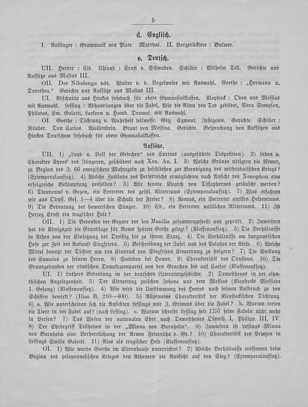 OII. 1) Die Bedenken der Gegner der lex Manilia zuſammengeſtellt und geprüft. 2) Inwiefern hat die Königszeit die Grundlage für Roms ſpätere Größe gelegt?(Klaſſenaufſatz). 3) Die Verhältniſſe in Athen von der Einſetzung der Dreißig bis zu ihrem Sturz. 4) Die Verhältniſſe am burgundiſchen Hofe zur Zeit der Ankunft Siegfrieds. 5) Beſchreibung der Inſel und des Palaſtes der Kirke. 6) Welche Mittel benutzt der Dichter um den Eindruck von Siegfrieds Ermordung zu ſteigern? 7) Die Stellung des Eumaios zu ſeinem Herrn. 8) Seeleben bei Homer. 9) Charakteriſtik des Odyſſeus. 10) Die Grundgedanken der römiſchen Demokratenpartei von den Gracchen bis auf Caeſar(Klaſſenaufſatz).