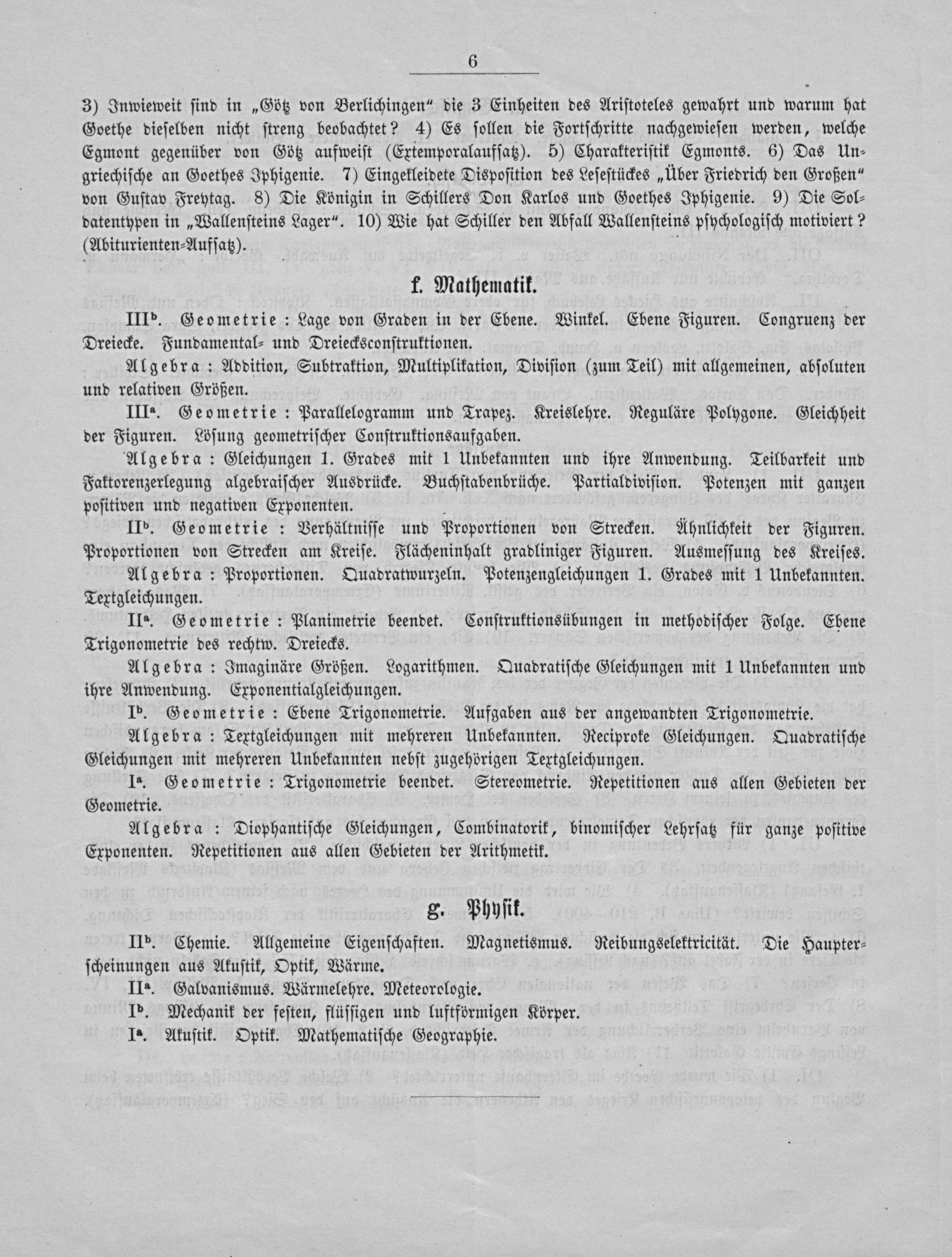 3) Inwieweit ſind in„Götz von Berlichingen“ die 3 Einheiten des Ariſtoteles gewahrt und warum hat Goethe dieſelben nicht ſtreng beobachtet? 4) Es ſollen die Fortſchritte nachgewieſen werden, welche Egmont gegenüber von Götz aufweiſt(Extemporalaufſatz). 5) Charakteriſtik Egmonts. 6) Das Un⸗ griechiſche an Goethes Iphigenie. 7) Eingekleidete Dispoſition des Leſeſtückes„Über Friedrich den Großen“ von Guſtav Freytag. 8) Die Königin in Schillers Don Karlos und Goethes Jphigenie. 9) Die Sol⸗ datentypen in„Wallenſteins Lager“. 10) Wie hat Schiller den Abfall Wallenſteins pſychologiſch motiviert? (Abiturienten⸗Aufſatz).—