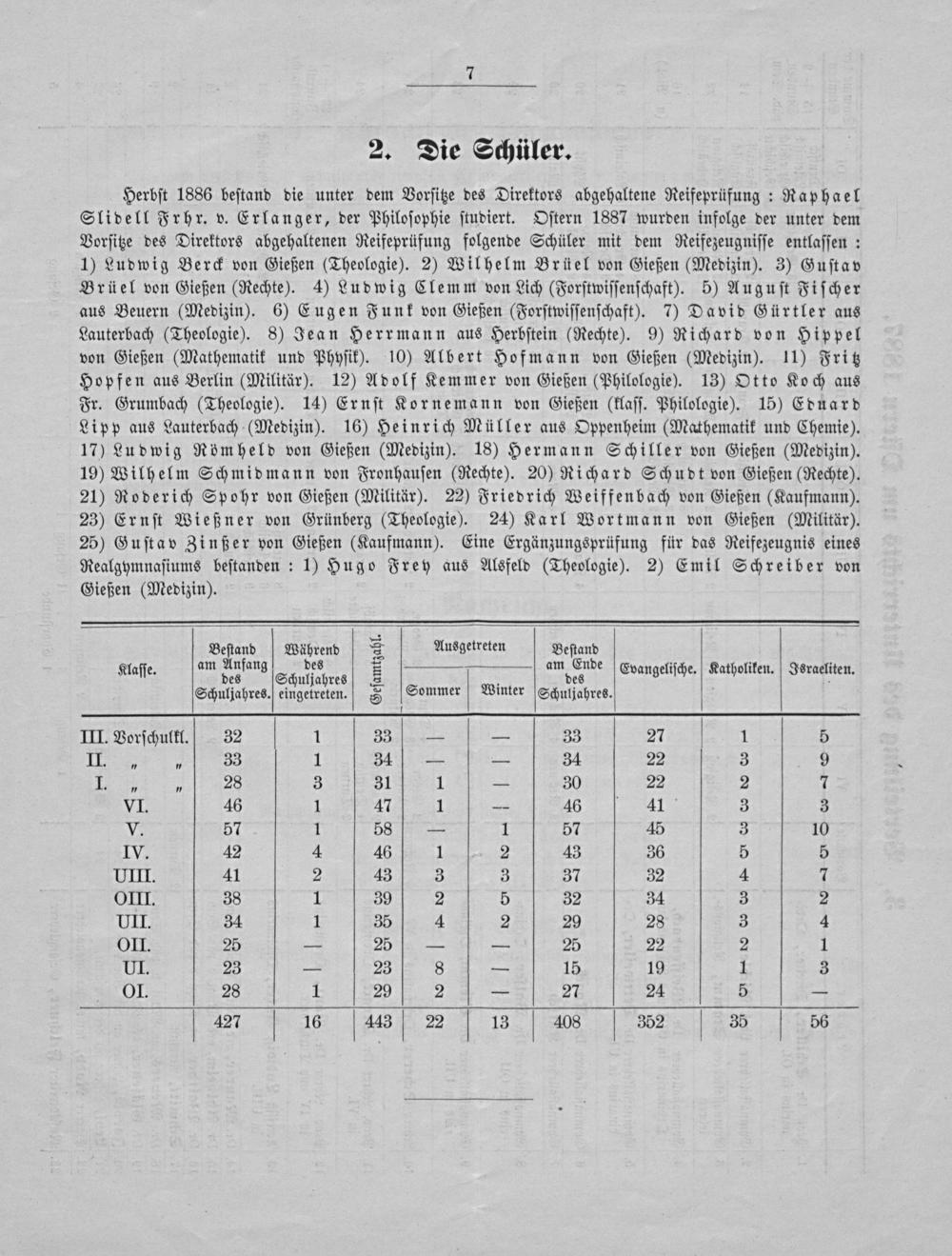 Herbſt 1886 beſtand die unter dem Vorſitze des Direktors abgehaltene Reifeprüfung: Raphael Slidell Frhr. v. Erlanger, der Philoſophie ſtudiert. Oſtern 1887 wurden infolge der unter dem Vorſitze des Direktors abgehaltenen Reifeprüfung folgende Schüler mit dem Reifezeugniſſe entlaſſen: 1) Ludwig Berck von Gießen(Theologie). 2) Wilhelm Brüel von Gießen(Medizin). 3) Guſtav Brüel von Gießen(Rechte). 4) Ludwig Clemm von Lich(Forſtwiſſenſchaft). 5) Auguſt Fiſcher aus Beuern(Medizin). 6) Eugen Funk von Gießen(Forſtwiſſenſchaft). 7) David Gürtler aus Lauterbach(Theologie). 8) Jean Herrmann aus Herbſtein(Rechte). 9) Richard von Hippel von Gießen(Mathematik und Phyſik). 10) Albert Hofmann von Gießen(Medizin). 11) Fritz Hopfen aus Berlin(Militär). 12) Adolf Kemmer von Gießen(Philologie). 13) Otto Koch aus Fr. Grumbach(Theologie). 14) Ernſt Kornemann von Gießen kklaſſ. Philologie). 15) Eduard Lipp aus Lauterbach(Medizin). 16) Heinrich Müller aus Oppenheim(Mathematik und Chemie). 17) Ludwig Römheld von Gießen(Medizin). 18) Hermann Schiller von Gießen(Medizin). 19) Wilhelm Schmidmann von Fronhauſen(Rechte). 20) Richard Schudt von Gießen(Rechte). 21) Roderich Spohr von Gießen(Militär). 22) Friedrich Weiffenbach von Gießen(Kaufmann). 23) Ernſt Wießner von Grünberg(Theologie). 24) Karl Wortmann von Gießen(Militär). 25) Guſtav Zinßer von Gießen(Kaufmann). Eine Ergänzungsprüfung für das Reifezeugnis eines Realgymnaſiums beſtanden: 1) Hugo Frey aus Alsfeld(Theologie). 2) Emil Schreiber von Gießen(Medizin).