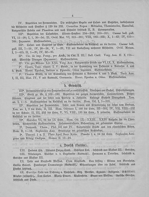 III“. Gerth gr. Gr.§ 169—190. Repetition der ganzen Formenlehre. Conjunctionen. Präpo⸗ ſitionen. Einzelnes aus der Lehre vom Particip u. Infinitiv. Anfangs Bachofs Übungsbuch. Xen. an. I, 1— 6. Klaſſenarbeiten im Anſchluß an die Lectüre. Hom. Od. I, 1—318.