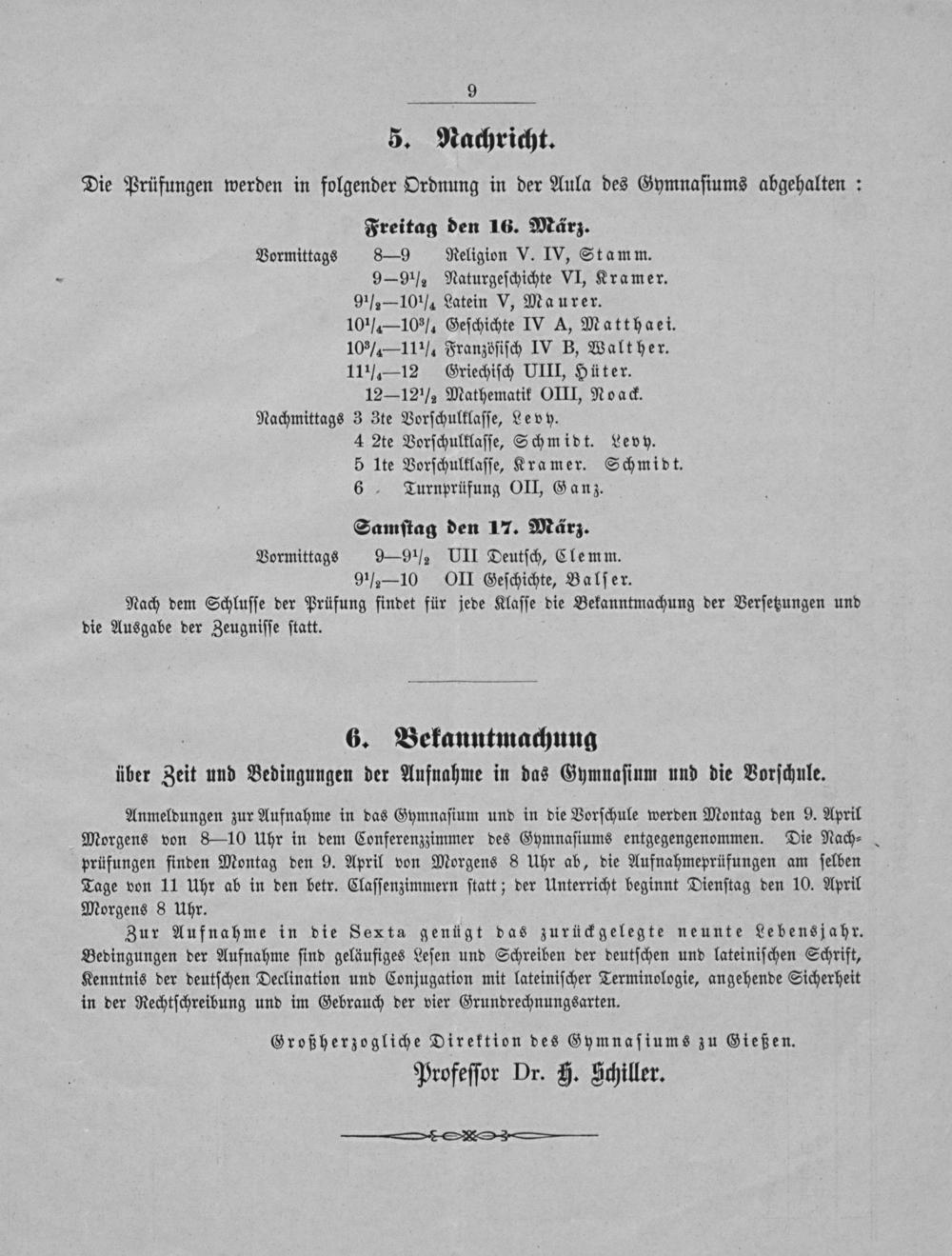 5. Nachricht. Die Prüfungen werden in folgender Ordnung in der Aula des Gymnaſiums abgehalten: