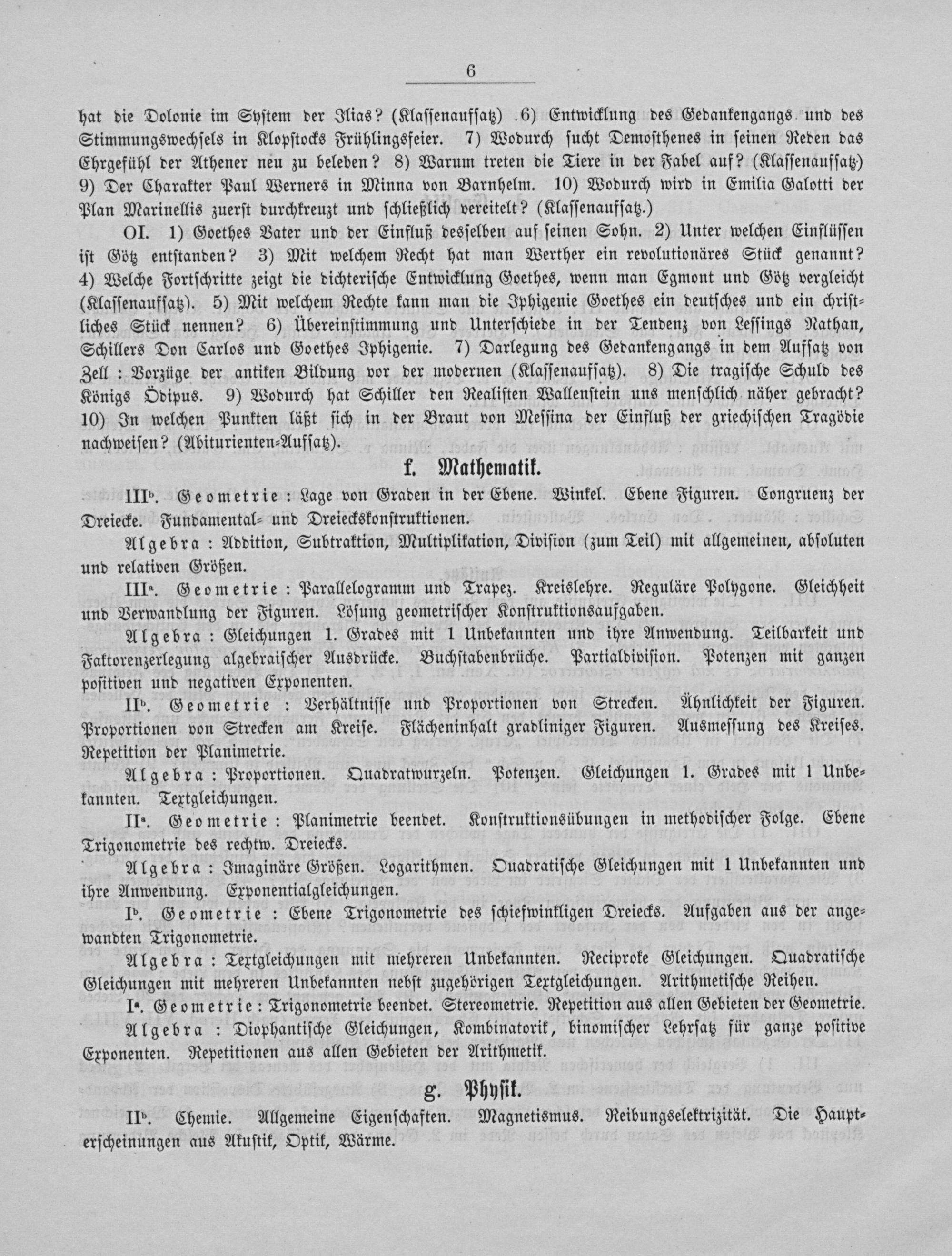 hat die Dolonie im Syſtem der Ilias?(Klaſſenaufſatz) 6) Entwicklung des Gedankengangs und des Stimmungswechſels in Klopſtocks Frühlingsfeier. 7) Wodurch ſucht Demoſthenes in ſeinen Reden das Ehrgefühl der Athener neu zu beleben? 8) Warum treten die Tiere in der Fabel auf?(Klaſſenaufſatz) 9) Der Charakter Paul Werners in Minna von Barnhelm. 10) Wodurch wird in Emilia Galotti der Plan Marinellis zuerſt durchkreuzt und ſchließlich vereitelt?(Klaſſenaufſatz.)