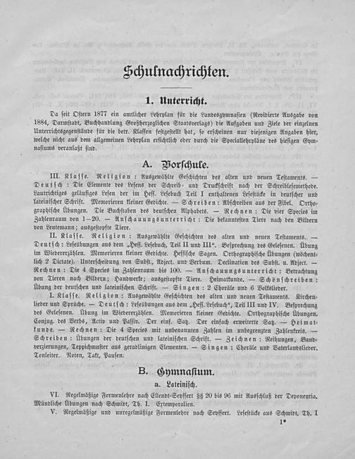 Da ſeit Oſtern 1877 ein amtlicher Lehrplan für die Landesgymnaſien(Revidierte Ausgabe von 1884, Darmſtadt, Buchhandlung Großherzoglichen Staatsverlags) die Aufgaben und Ziele der einzelnen Unterrichtsgegenſtände für die betr. Klaſſen feſtgeſtellt hat, ſo erſcheinen nur diejenigen Angaben hier, welche nicht aus dem allgemeinen Lehrplan erſichtlich oder durch die Speciallehrpläne des hieſigen Gym⸗ naſiums veranlaßt ſind.