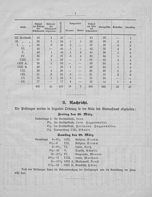 3. Nachricht. Die Prüfungen werden in folgender Ordnung in der Aula des Gymnaſiums abgehalten: