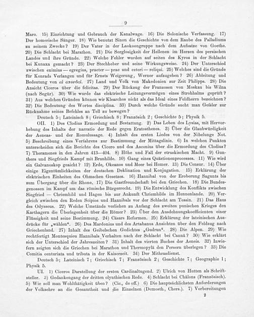 OII. 1) Des Clodius Ermordung und Bestattung. 2) Das Leben des Lysias, mit Hervor- hebung des Inhalts der narratio der Rede gegen Eratosthenes. 3) Über die Glaubwürdigkeit der Aeneas- und der Romulussage. 4) Inhalt des ersten Liedes von der Nibelunge Not. 5) Beschreibung eines Verfahrens zur Bestimmung der Mittagslinie. 6) In welchen Punkten unterscheiden sich die Berichte des Cicero und des Asconius über die Ermordung des Clodius? 7) Theramenes in den Jahren 413— 404. 8) Höhe und Fall der etruskischen Macht. 9) Gun- thers und Siegfrieds Kampf mit Brunhilde. 10) Gang eines Quästionenprocesses. 11) Wie wird ein Galvanoskop geaicht? 12) Erde, Okeanos und Meer bei Homer. 13) Die Censur. 14) Über einige Eigentümlichkeiten der deutschen Deklination und Konjugation. 15) Erklärung der elektrischen Einheiten des Ohmschen Gesetzes. 16) Hannibal von der Eroberung Sagunts bis zum Ubergang über die Rhone. 17) Die Gastfreundschaft bei den Griechen. 18) Die Bundes- genossen im Kampf um das römische Bürgerrecht. 19) Die Entwicklung des Konflikts zwischen Siegfried— Chriemhild und Hagen bis zur Ankunft Chriemhilds im Hunnenlande. 20) Ver- gleich zwischen den Reden Scipios und Hannibals vor der Schlacht am Tessin. 21) Das Haus des Odysseus. 22) Welche Umstände verliehen zu Anfang des zweiten punischen Krieges den Karthagern die Uberlegenheit über die Römer? 23) Über den Ausdehnungskoefficienten einer Flüssigkeit und seine Bestimmung. 24) Cäsars Reformen. 25) Erklärung der lateinischen Aus- drücke für„wählen“. 26) Des Mardonius und des Artabanus Ansichten über den Feldzug nach Griechenland. 27) Inhalt des Geibelschen Gedichtes„Gudrun“. 28) Die Alpen. 29) Wie rechtfertigt Montesquieu Hannibals Verhalten nach der Schlacht bei Cannä? 30) Wie erklärt sich der Unterschied der Jahreszeiten? 31) Inhalt des vierten Buches der Aeneis. 32) Inwie- fern zeigten sich die Griechen bei Marathon und Thermopylä den Persern überlegen? 33) Die Comitia centuriata und tributa in der Kaiserzeit. 34) Der Mithrasdienst.