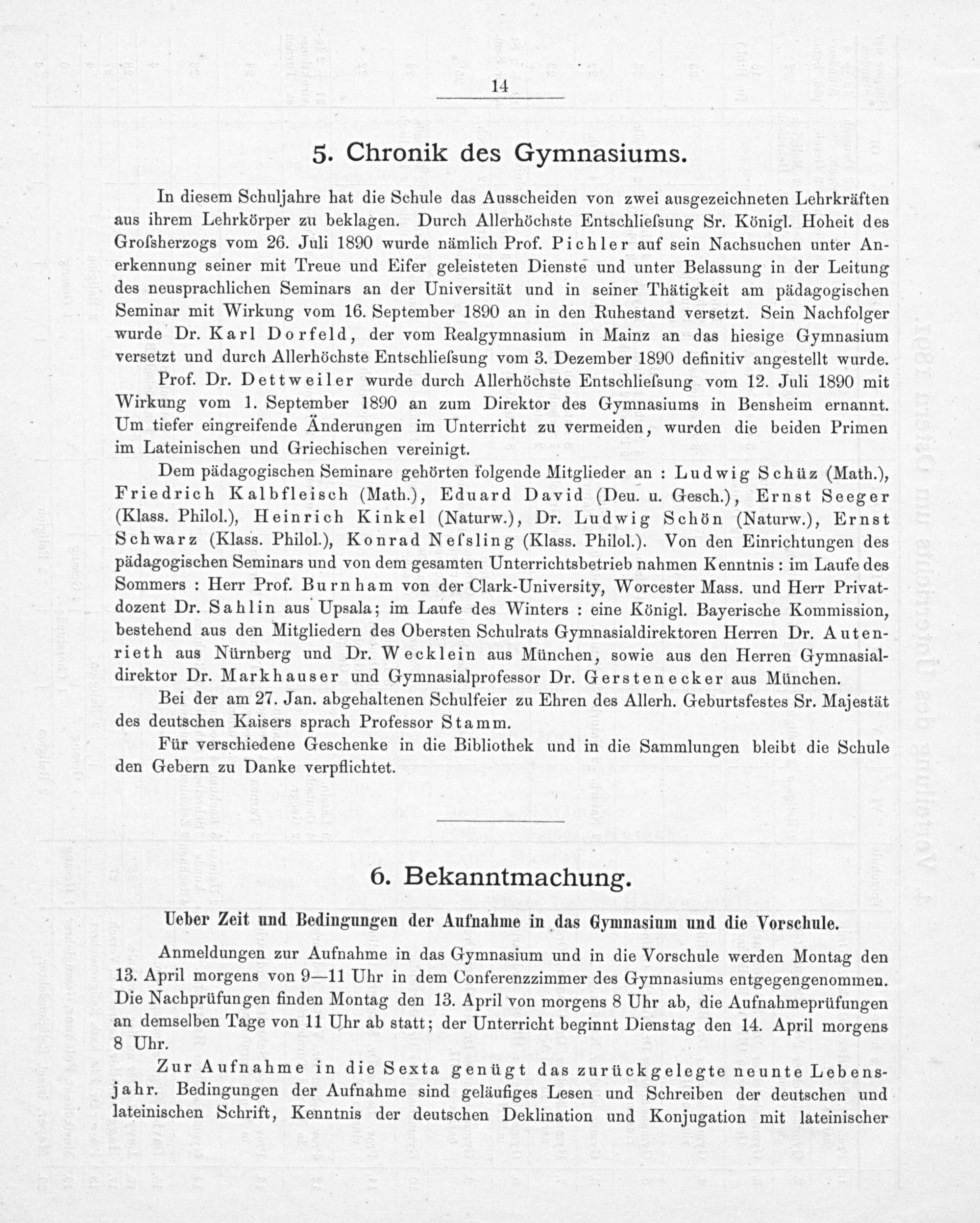 Prof. Dr. Dettweiler wurde durch Allerhöchste Entschlieſsung vom 12. Juli 1890 mit Wirkung vom 1. September 1890 an zum Direktor des Gymnasiums in Bensheim ernannt. Um tiefer eingreifende Anderungen im Unterricht zu vermeiden, wurden die beiden Primen im Lateinischen und Griechischen vereinigt.