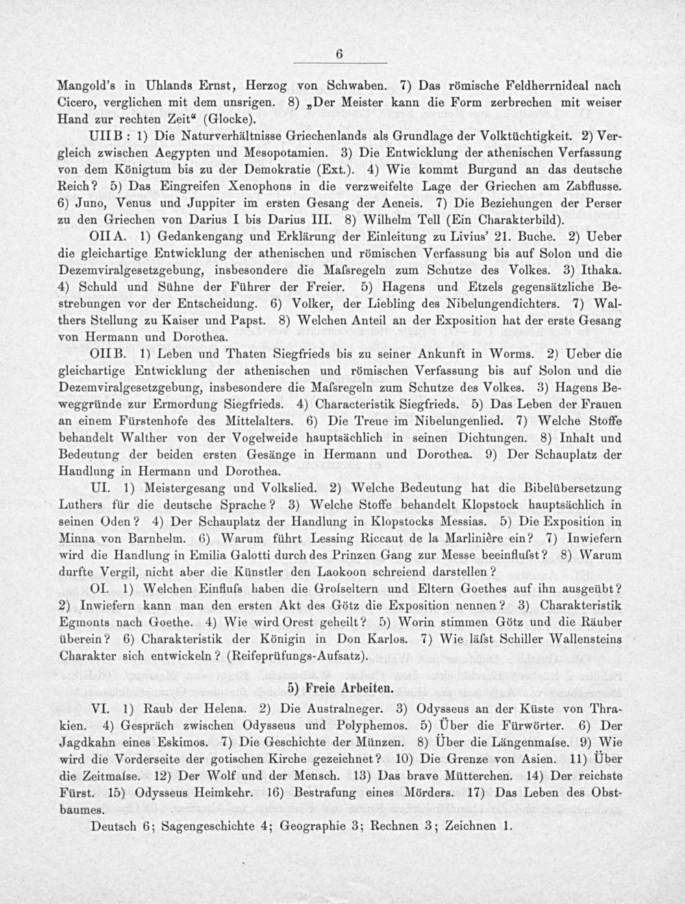 OIIA. 1) Gedankengang und Erklärung der Einleitung zu Livius' 21. Buche. 2) Ueber die gleichartige Entwicklung der athenischen und römischen Verfassung bis auf Solon und die Dezemviralgesetzgebung, insbesondere die Maſsregeln zum Schutze des Volkes. 3) Ithaka. 4) Schuld und Sühne der Führer der Freier. 5) Hagens und Etzels gegensätzliche Be- strebungen vor der Entscheidung. 6) Volker, der Liebling des Nibelungendichters. 7) Wal- thers Stellung zu Kaiser und Papst. 8) Welchen Anteil an der Exposition hat der erste Gesang von Hermann und Dorothea.