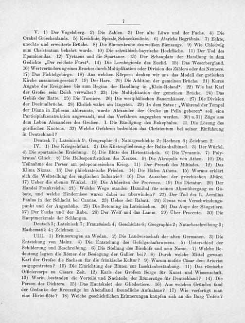 UIII. 1) Erinnerungen an Wodan. 2) Die Landwirtschaft der alten Germanen. 3) Die Entstehung von Mainz. 4) Die Entstehung des Gefolgschaftswesens. 5) Unterschied der Schilderung und Beschreibung. 6) Die Stellung des Bischofs und sein Name. 7) Welche Be- deutung legten die Römer der Besiegung der Gallier bei? 8) Durch welche Mittel gewann Karl der Groſse die Sachsen für die fränkische Kultur? 9) Warum muſste Cäsar dem Ariovist entgegentreten? 10) Die Einrichtung der Blüten zur Insektenbestäubung. 11) Das römische Officiercorps zu Cüsars Zeit. 12) Karls des Groſsen Sorge für Kunst und Wissenschaft. 13) Worin bestanden die Vorteile und Nachteile der Römerzüge für Deutschland? 14) Die Person des Dichters. 15) Das Hautskelet der Gliedertiere. 16) Aus welchen Gründen fand der Gedanke der Kreuzzüge im Abendland freundliche Aufnahme? 17) Wie verfertigt man eine Hirtenflöte? 18) Welche geschichtlichen Erinnerungen knüpfen sich an die Burg Trifels?