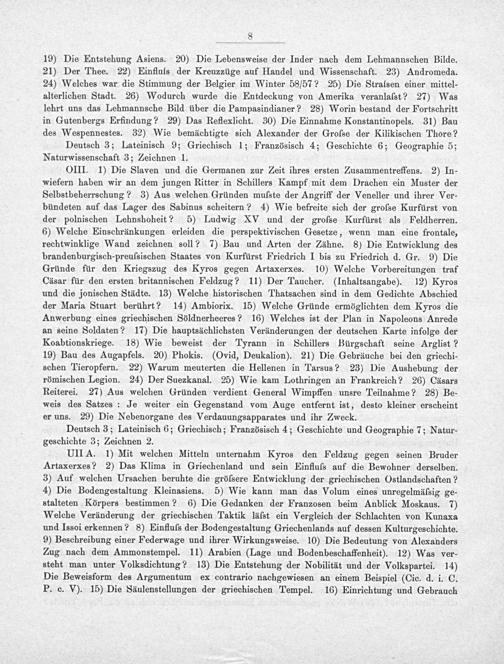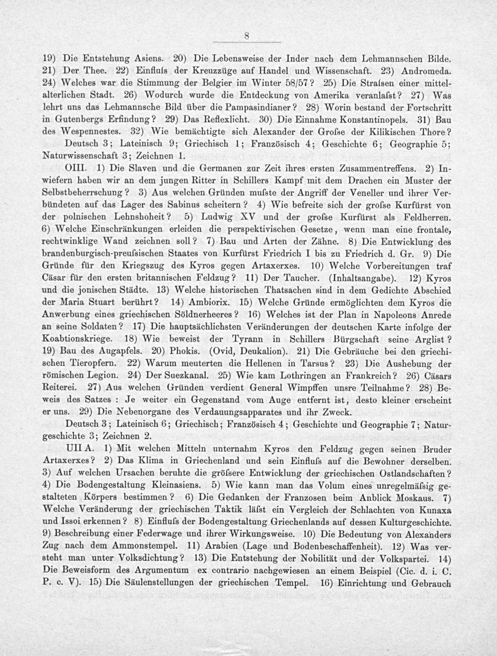 UIIA. 1) Mit welchen Mitteln unternahm Kyros den Feldzug gegen seinen Bruder Artaxerxes? 2) Das Klima in Griechenland und sein Einfluſs auf die Bewohner derselben. 3) Auf welchen Ursachen beruhte die gröſsere Entwicklung der griechischen Ostlandschaften? 4) Die Bodengestaltung Kleinasiens. 5) Wie kann man das Volum eines unregelmäſsig ge- stalteten Körpers bestimmen? 6) Die Gedanken der Franzosen beim Anblick Moskaus. 7) Welche Veränderung der griechischen Taktik läſst ein Vergleich der Schlachten von Kunaxa und Issoi erkennen? 8) Einfluſs der Bodengestaltung Griechenlands auf dessen Kulturgeschichte. 9) Beschreibung einer Federwage und ihrer Wirkungsweise. 10) Die Bedeutung von Alexanders Zug nach dem Ammonstempel. 11) Arabien(Lage und Bodenbeschaffenheit). 12) Was ver- steht man unter Volksdichtung? 13) Die Entstehung der Nobilität und der Volkspartei. 14) Die Beweisform des Argumentum ex contrario nachgewiesen an einem Beispiel(Cic. d. i. C. P. c. V). 15) Die Säulenstellungen der griechischen Tempel. 16) Einrichtung und Gebrauch