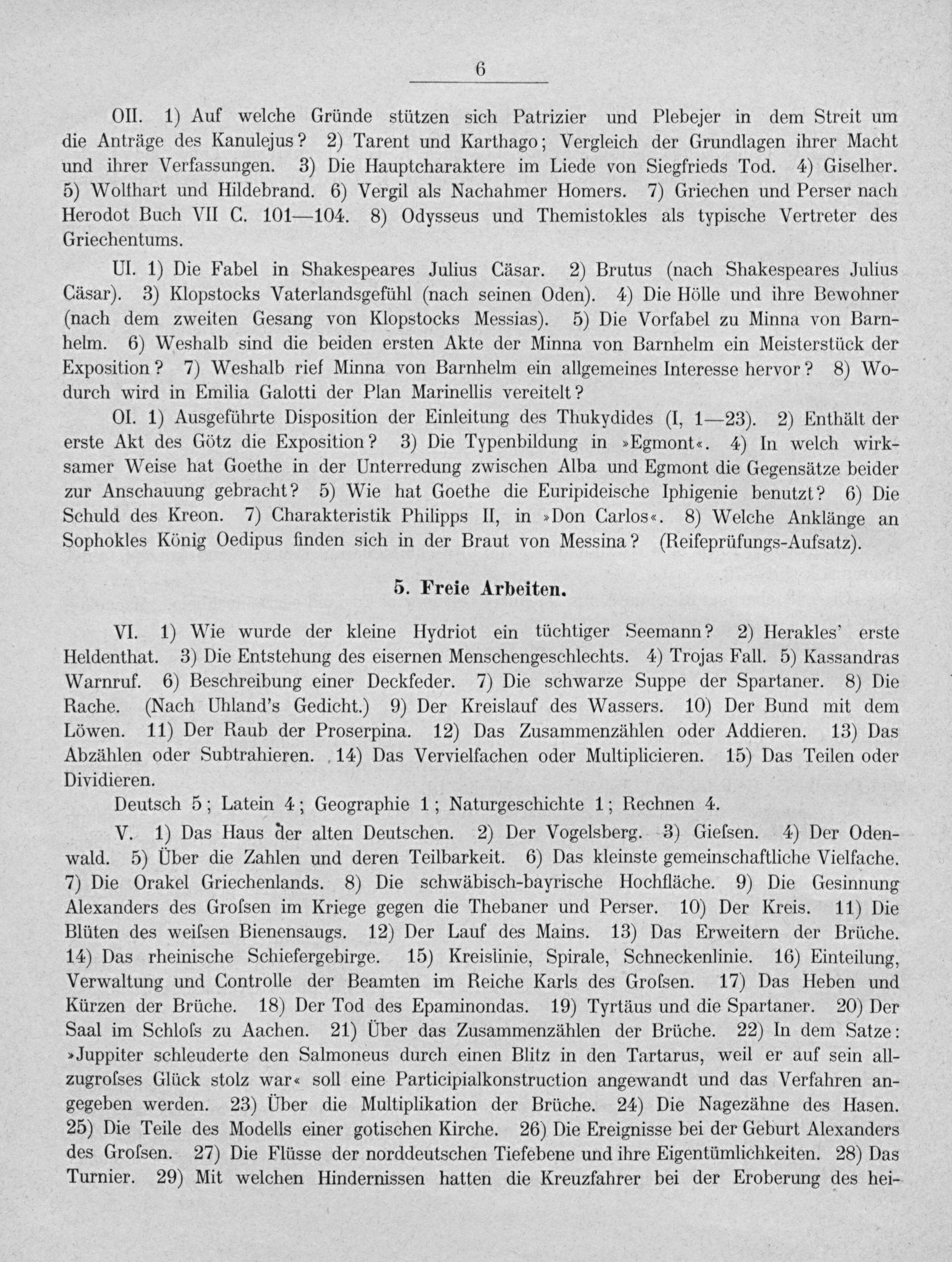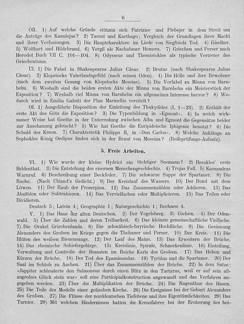 V. 1) Das Haus der alten Deutschen. 2) Der Vogelsberg. 3) Giefsen. 4) Der Oden- wald. 5) Über die Zahlen und deren Teilbarkeit. 6) Das kleinste gemeinschaftliche Vielfache. 7) Die Orakel Griechenlands. 8) Die schwäbisch-bayrische Hochfläche. 9) Die Gesinnung Alexanders des Grofsen im Kriege gegen die Thebaner und Perser. 10) Der Kreis. 11) Die Blüten des weilsen Bienensaugs. 12) Der Lauf des Mains. 13) Das Erweitern der Brüche. 14) Das rheinische Schiefergebirge. 15) Kreislinie, Spirale, Schneckenlinie. 16) Einteilung, Verwaltung und Controlle der Beamten im Reiche Karls des Grolsen. 17) Das Heben und Kürzen der Brüche. 18) Der Tod des Epaminondas. 19) Tyrtäus und die Spartaner. 20) Der Saal im Schlols zu Aachen. 21) Uber das Zusammenzählen der Brüche. 22) In dem Satze: »Juppiter schleuderte den Salmoneus durch einen Blitz in den Tartarus, weil er auf sein all- zugrolses Glück stolz war« soll eine Participialkonstruction angewandt und das Verfahren an- gegeben werden. 23) Uber die Multiplikation der Brüche. 24) Die Nagezähne des Hasen. 25) Die Teile des Modells einer gotischen Kirche. 26) Die Ereignisse bei der Geburt Alexanders des Groſsen. 27) Die Flüsse der norddeutschen Tiefebene und ihre Eigentümlichkeiten. 28) Das Turnier. 29) Mit welchen Hindernissen hatten die Kreuzfahrer bei der Eroberung des hei-