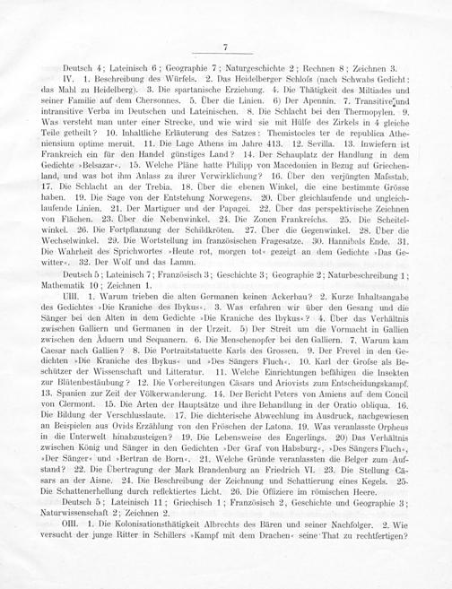 Deutsch 5; Lateinisch 7; Französisch 3; Geschichte 3; Geographie 2; Naturbeschreibung 1; Mathematik 10; Zeichnen 1.
