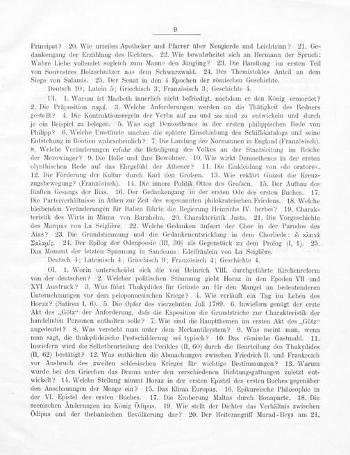 OlI. 1. Worin unterscheidet sich die von Heinrich VIII. durchgeführte Kirchenreform von der deutschen? 2. Welcher politischen Stimmung giebt Horaz in den Epoden VII und XVI Ausdruck? 3. Was führt Thukydides für Gründe an für den Mangel an bedeutenderen Unternehmungen vor dem peloponnesischen Kriege? 4. Wie verläuft ein Tag im Leben des Horaz?(Satiren I, 6). 5. Die Opfer des vierzehnten Juli 1789. 6. Inwiefern genügt der erste Akt des„Götz’ der Anforderung, dals die Exposition die Grundstriche zur Charakteristik der handelnden Personen enthalten solle? 7. Wie sind die Hauptthemen im ersten Akt des„Götz““ angedeutet? 8. Was versteht man unter dem Merkantilsystem? 9. Was meint man, wenn man sagt, die thukydideische Pestschilderung sei typisch? 10. Das römische Gastmahl. 11. Inwiefern wird die Selbstbeurteilung des Perikles(II, 60) durch die Beurteilung des Thukydides (II, 62) bestätigt? 12. Was enthielten die Abmachungen zwischen Friedrich II. und Frankreich vor Ausbruch des zweiten schlesischen Krieges für wichtige Bestimmungen? 13. Warum wurde bei den Griechen das Drama unter den verschiedenen Dichtungsgattungen zuletzt ent- wickelt? 14. Welche Stellung nimmt Horaz in der ersten Epistel des ersten Buches gegenüber den Anschauungen der Menge ein? 15. Das Klima Europas. 16. Epikureische Philosophie in der VI. Epistel des ersten Buches. 17. Die Eroberung Maltas durch Bonaparte. 18. Die scenischen Anderungen im König Odipus. 19. Wie stellt der Dichter das Verhältnis zwischen Odipus und der thebanischen Bevölkerung dar? 20. Der Reiterangriff Murad-Beys am 21.