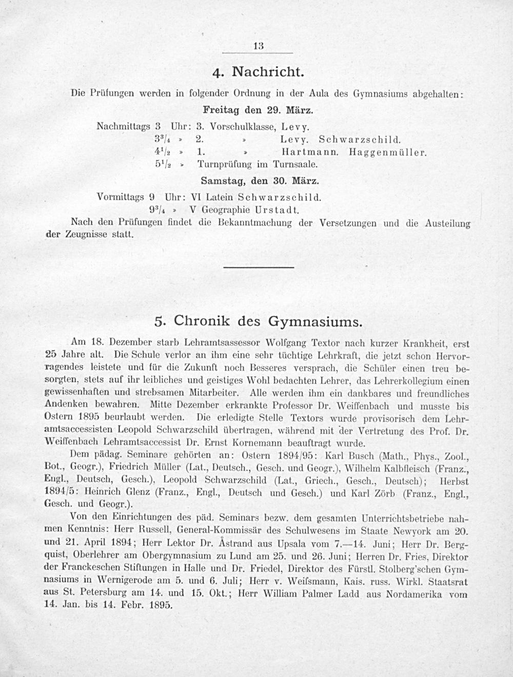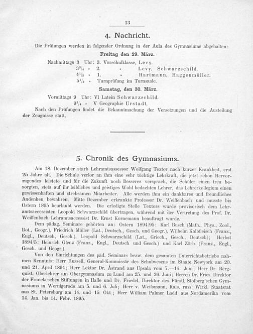 Am 18. Dezember starb Lehramtsassessor Wolfgang Textor nach kurzer Krankheit, erst 25 Jahre alt. Die Schule verlor an ihm eine sehr tüchtige Lehrkraft, die jetzt schon Hervor- ragendes leistete und für die Zukunft noch Besseres versprach, die Schüler einen treu be- sorgten, stets auf ihr leibliches und geistiges Wohl bedachten Lehrer, das Lehrerkollegium einen gewissenhaften und strebsamen Mitarbeiter. Alle werden ihm ein dankbares und freundliches Andenken bewahren. Mitte Dezember erkrankte Professor Dr. Weiffenbach und musste bis Ostern 1895 beurlaubt werden. Die erledigte Stelle Textors wurde provisorisch dem Lehr- amtsaccessisten Leopold Schwarzschild übertragen, während mit der Vertretung des Prof. Dr. Weiffenbach Lehramtsaccessist Dr. Ernst Kornemann beauftragt wurde.