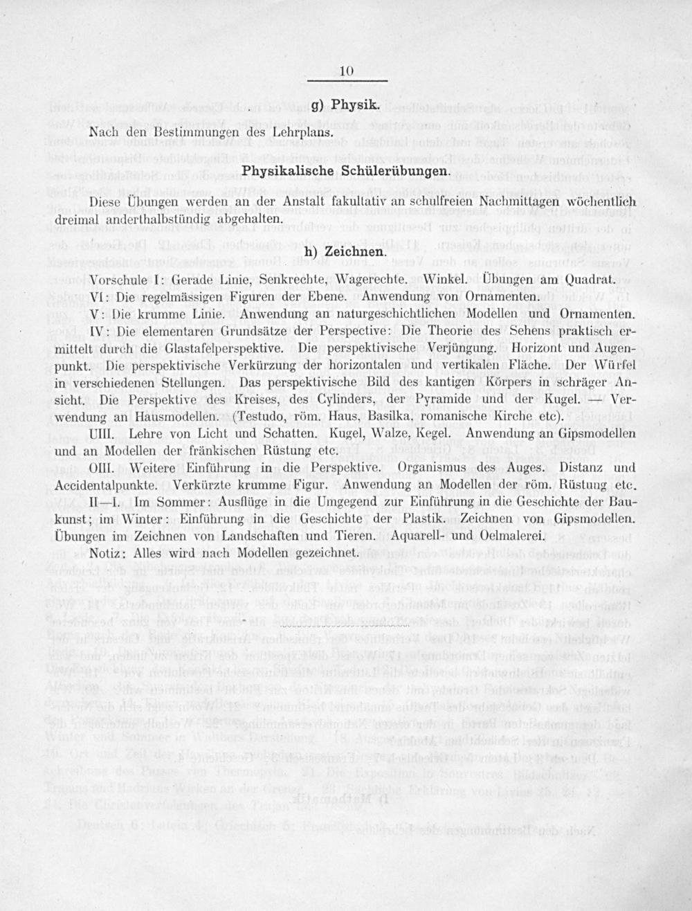 II— I. Im Sommer: Ausflüge in die Umgegend zur Einführung in die Geschichte der Bau- kunst; im Winter: Einführung in die Geschichte der Plastik. Zeichnen von Gipsmodellen. Ubungen im Zeichnen von Landschaften und Tieren. Aquarell- und Oelmalerei.