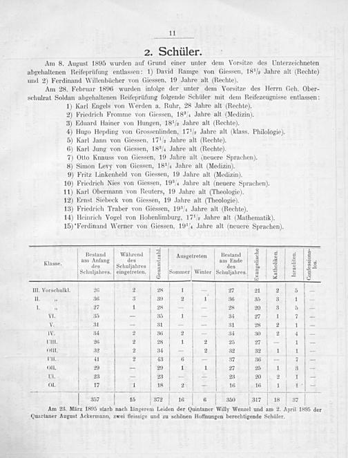 Am 8. August 1895 wurden auf Grund einer unter dem Vorsitze des Unterzeichneten abgehaltenen Reifeprüfung entlassen: 1) David Ramge von Giessen, 18 ½ Jahre alt(Rechte) und 2) Ferdinand Willenbücher von Giessen, 19 Jahre alt(Rechte).