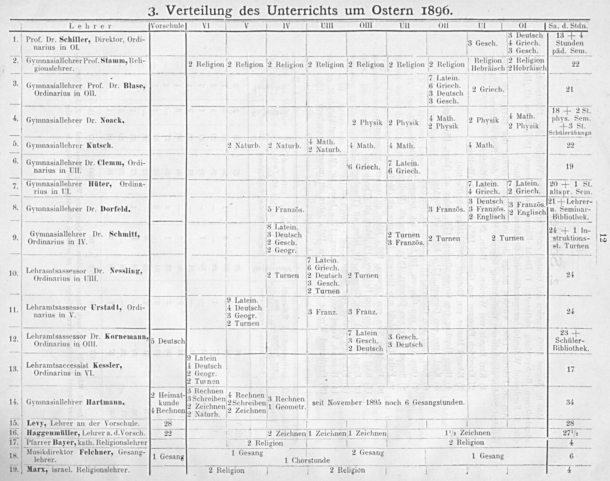 3. Verteilung des Unterrichts um Ostern 1896.