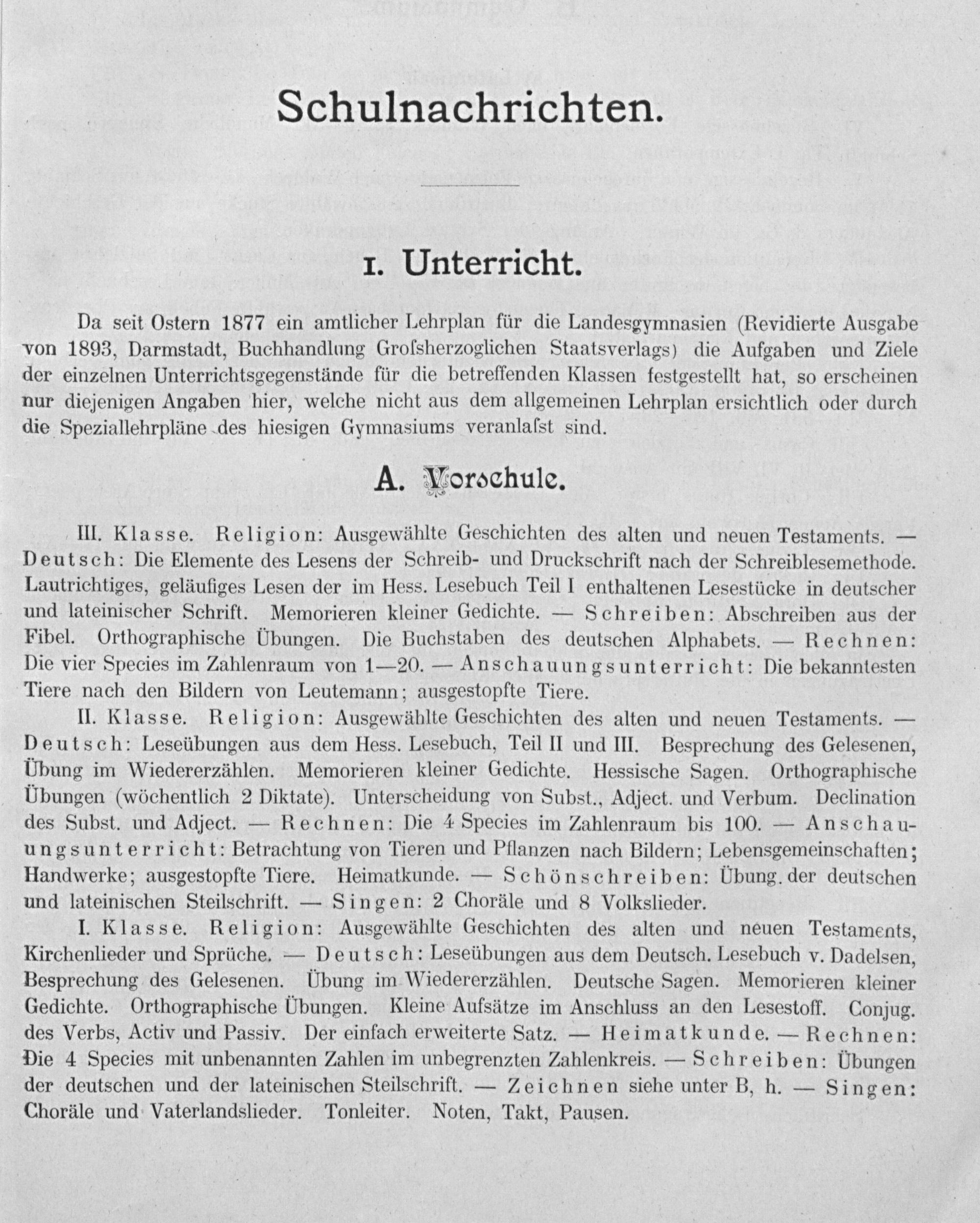 Da seit Ostern 1877 ein amtlicher Lehrplan für die Landesgymnasien(Revidierte Ausgabe von 1893, Darmstadt, Buchhandlung Grolsherzoglichen Staatsverlags) die Aufgaben und Ziele der einzelnen Unterrichtsgegenstände für die betreffenden Klassen festgestellt hat, so erscheinen nur diejenigen Angaben hier, welche nicht aus dem allgemeinen Lehrplan ersichtlich oder durch die Speziallehrpläne des hiesigen Gymnasiums veranlaſst sind.