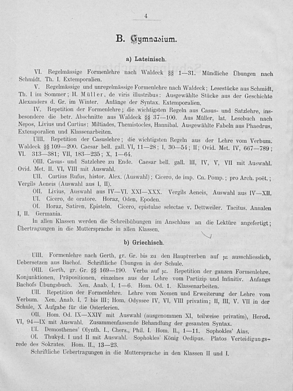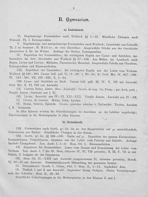 IV. Repetition der Formenlehre; die wichtigsten Regeln aus Casus- und Satzlehre, ins- besondere die betr. Abschnitte aus Waldeck§§ 37— 100. Aus Müller, lat. Lesebuch nach Nepos, Livius und Curtius: Miltiades, Themistocles, Hannibal. Ausgewählte Fabeln aus s Phaedrus, Extemporalien und Klassenarbeiten.