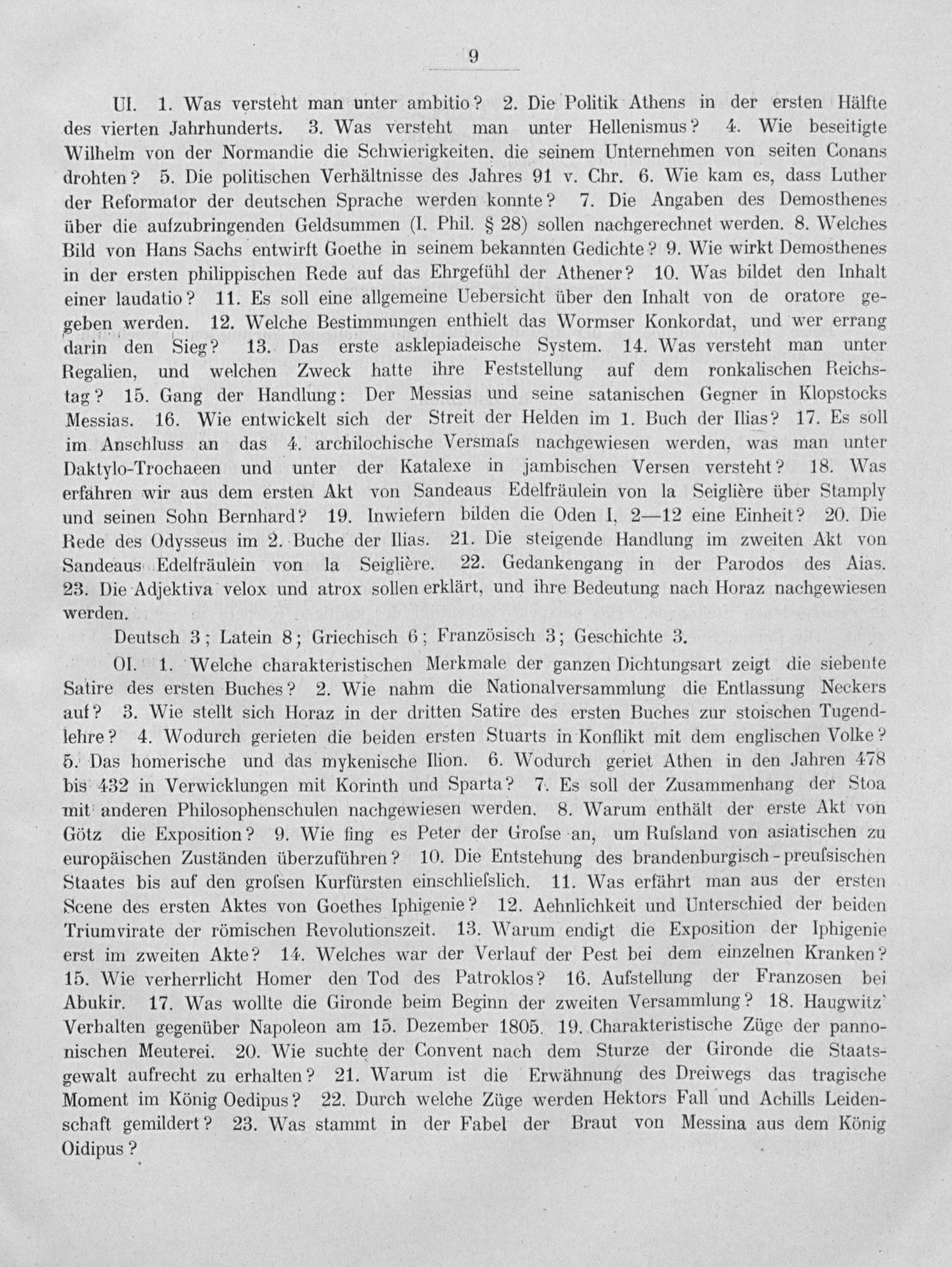 0I. 1. Welche charakteristischen Merkmale der ganzen Dichtungsart zeigt die siebente Satire des ersten Buches? 2. Wie nahm die Nationalversammlung die Entlassung Neckers auf? 3. Wie stellt sich Horaz in der dritten Satire des ersten Buches zur stoischen Tugend- lehre? 4. Wodurch gerieten die beiden ersten Stuarts in Konflikt mit dem englischen Volke? 5. Das homerische und das mykenische Ilion. 6. Wodurch geriet Athen in den Jahren 478 bis 432 in Verwicklungen mit Korinth und Sparta? 7. Es soll der Zusammenhang der Stoa mit anderen Philosophenschulen nachgewiesen werden. 8. Warum enthält der erste Akt von Götz die Exposition? 9. Wie fing es Peter der Grolse an, um Rulsland von asiatischen zu europäischen Zuständen überzuführen? 10. Die Entstehung des brandenburgisch-preulsischen Staates bis auf den grofsen Kurfürsten einschliefslich. 11. Was erfährt man aus der ersten Scene des ersten Aktes von Goethes Iphigenie? 12. Aehnlichkeit und Unterschied der beiden Triumvirate der römischen Revolutionszeit. 13. Warum endigt die Exposition der Iphigenie erst im zweiten Akte? 14. Welches war der Verlauf der Pest bei dem einzelnen Kranken? 15. Wie verherrlicht Homer den Tod des Patroklos? 16. Aufstellung der Franzosen bei Abukir. 17. Was wollte die Gironde beim Beginn der zweiten Versammlung? 18. Haugwitz! Verbalten gegenüber Napoleon am 15. Dezember 1805. 19. Charakteristische Züge der panno- nischen Meuterei. 20. Wie suchte der Convent nach dem Sturze der Gironde die Staats- gewalt aufrecht zu erhalten? 21. Warum ist die Erwühnung des Dreiwegs das tragische Moment im König Oedipus? 22. Durch welche Züge werden Hektors Fall und Achills Leiden- schaft gemildert? 23. Was stammt in der Fabel der Braut von Messina aus dem König Oidipus?