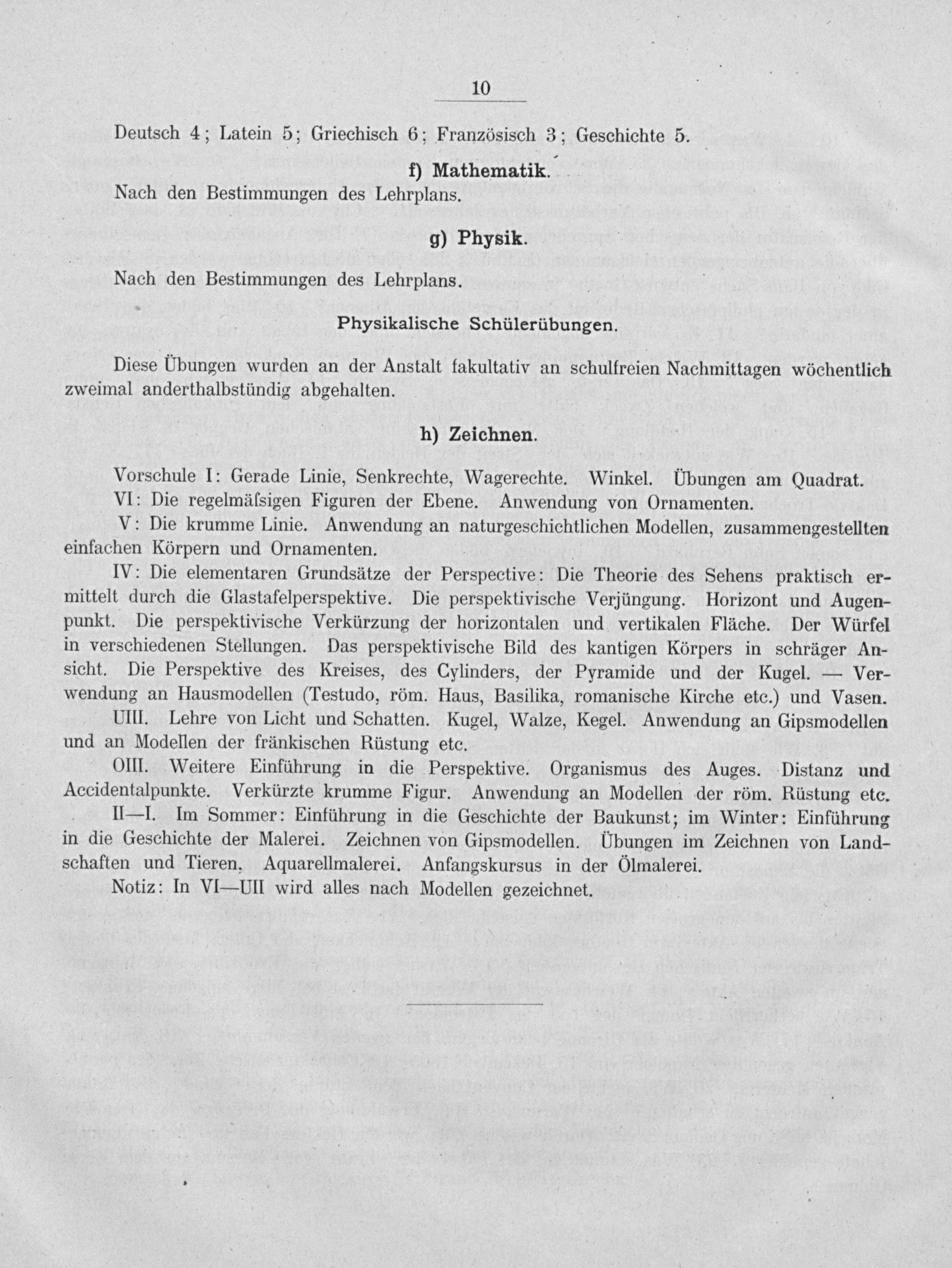 IV: Die elementaren Grundsätze der Perspective: Die Theorie des Sehens praktisch er- mittelt durch die Glastafelperspektive. Die perspektivische Verjüngung. Horizont und Augen- punkt. Die perspektivische Verkürzung der horizontalen und vertikalen Fläche. Der Würfel in verschiedenen Stellungen. Das perspektivische Bild des kantigen Körpers in schräger An- sicht. Die Perspektive des Kreises, des Cylinders, der Pyramide und der Kugel.— Ver- wendung an Hausmodellen(Testudo, röm. Haus, Basilika, romanische Kirche etc.) und Vasen.