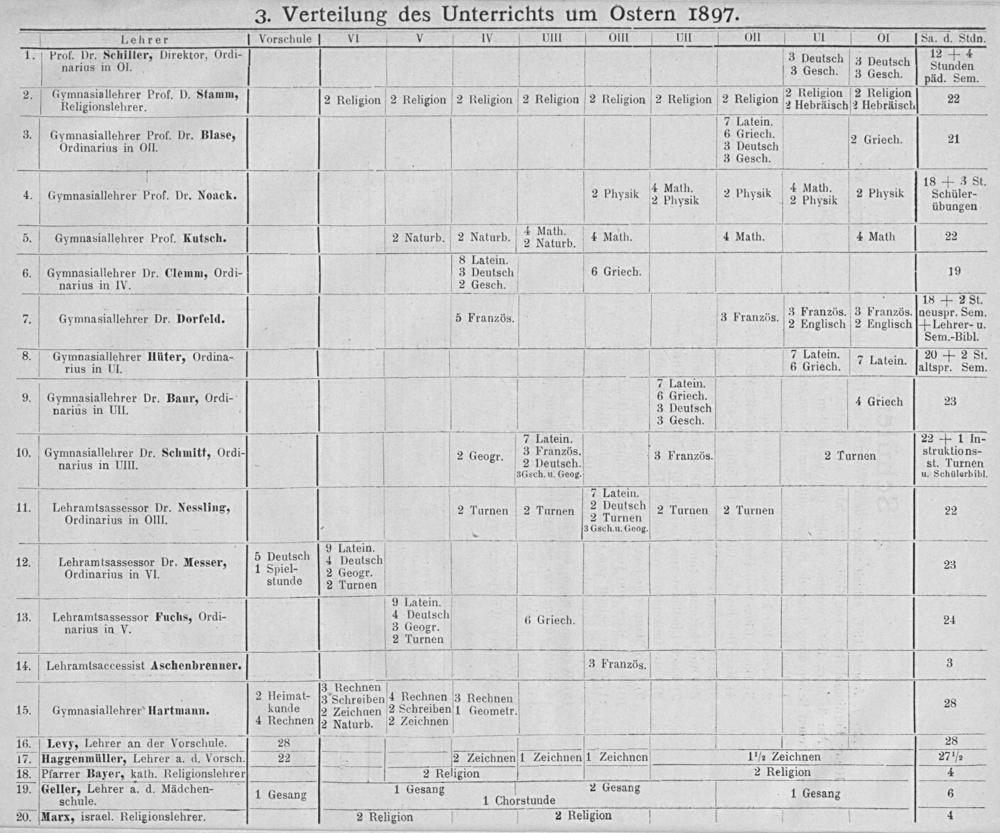 ſ Lechrer Vorschule füfüfmmm öiin 01 Sa. 4. Stdn. 1. Prof. Dr. Schiller, Direktor, Ordi- 3 Deutsch 12+ 4 Dr. 3 Deutsch! Stund narius in Ol. b V 3 Gesch. 3 Gesch. pan en. 2. Gymnasiallehrer Prof. D. Stamm, 3 Leion ⸗ 4 1 Iui. eie, 2 Religion 2 Religion Religionslehrer.* 2 Religion 2 Religion 2 Religion V 2 Religion 2 Religion 2 Religion V 2 Religion 2² Hebräisch ² Hebräisch 22 —— 7 Latein. 3. Gymnasiallehrer Prof. Dr. Blase, 6 Griech. 2 Criech. 21 Ordinarius in Oll. b V 4 Deutseh riee esch. b 18+ 3 8t. 2 k 4 Math. weib. 4. Gymnasiallehrer Prof. Dr. Noack. V 2 Physik mare 2 Physik 2 Prk 2 Physik Sehrüler. übungen — 5 5. I Gymnasiallehrer Prof. Kutsch. 2 Naturb. 2 Naturb. V 4 ue 4 Math. V 4 Math. I I 4 Math 22 8 Latein. 6. Gymnasiallehrer Dr. Clemm, Ordi- 3 Deutsch 6 Griech. 19 narius in IV. 2 Gesch. 1 4 18+ 2 Ft. Kallehrer Dr. Dorfel 5 Fra 3 Franzbs. 3 Französ. 3 Französ. neuspr. Sem. 7. Gymnasiallehrer Dr. Dorfeld. ranzös. 2 Englisch 2 Englisch Lehrer- u. Sem. Bibl. 8. Gymnasiallehrer Hüter, Ordina- 7 Latein. 7 4 20+ 2 St. V klus in UI. 3 P. 6 Griech. Latein. altspr. Sem. 7 Latein. 9. Gymnasiallehrer Dr. Baur, Ordi- V 6 Griech. 4 Griech 23 narius in UII. 3 Deutsch 3 Gesch. 7 Latein. 22+ 1 iIn- 10. Gymnasiallehrer Dr. Schmitt, Ordi- 2 Geogr. 3 DEAhgüs. 3 PFranzös. 2 Turnen diruhetions⸗ rius j. 2 hDeutsch. st. Turnen narius in UIII. V 36Gsch. u. Geog. u. Schülerbibl. 1 ¹ 1 1 3 i 7 Latein. 11. Lehramtsassessor Dr. Nessling, 2 Turnen 2 Turnen 2 Deutsch 2 Turnen 2 Turnen 22 Ordinarius in OllI.. 12aNürnen — Se 3 Deutsch7 Latein..— 12. Lehramtsassessor Dr. Messer, 1 Heulse 1[4 Deutsch 23 Ordinarius in VI. huncde 2 Geogr. V stunde 2 Turnen ſ 5 9 Latein. 13. Lehramtsassessor Fuchs, Ordi 4 Deutsch 6 Griech. 24 narius in V. 3 Geogr. — 2 Turnen V 14. Lehramtsaccessist Aschenbrenner. 3 Französ. 3 9. 3 Rechnen— 8 . 2 Heimat- 3 Schreiben 4 Rechnen 3 Rechnen 28 15. Gymnasiallehrer Hartmann. kunde[2 Zeichnen 2 Schreibent Geometr. 4 Rechnen 2 Naturb. 2 Zeichnen 8 16. Levy, Lehrer an der Vorschule. 28* 28 17. Haggenmüller, Lehrer a. d. Vorsch. 22² 2 Zeichnen 1 Zeichnen l Zeichnon 1 ½ Zeichnen 27 ½ 18. Pfarrer Bayer, kath. Religionslehrer 2 Religion 2 Religion 4 19. Geller, Lehrer a. d. Mädchen- 1 Gesang 2 Gesang schule. 1 Gesang 1 Chorstunde 1 Gesanz 6 20. 2 Religion 4