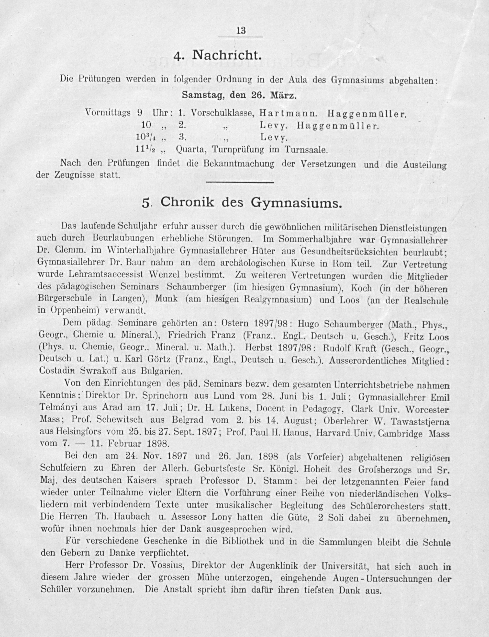 Bei den am 24. Nov. 1897 und 26. Jan. 1898(als Vorfeier) abgehaltenen religiösen Schulfeiern zu Ebren der Allerh. Geburtsfeste Sr. Königl. Hoheit des Grolsherzogs und Sr. Maj. des deutschen Kaisers sprach Professor D. Stamm: bei der letzgenannten Feier fand wieder unter Teilnahme vieler Eltern die Vorführung einer Reihe von niederländischen Volks- liedern mit verbindendem Texte unter musikalischer Begleitung des Schülerorchesters statt. Die Herren Th. Haubach u. Assessor Lony hatten die Güte, 2 Soli dabei zu übernehmen, wofür ihnen nochmals hier der Dank ausgesprochen wird.