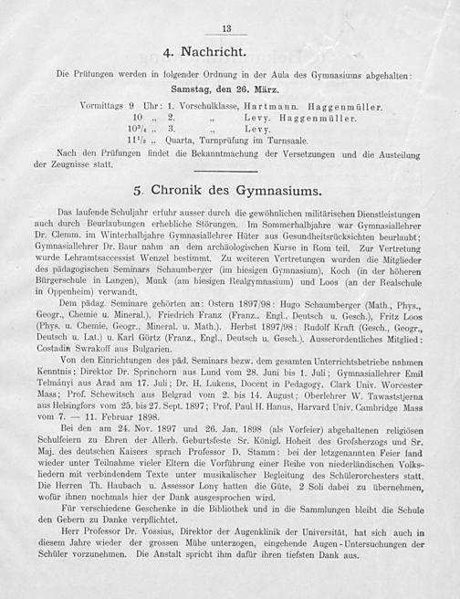 Dem pädag. Seminare gehörten an: Ostern 1897/98: Hugo Schaumberger(Math., Phys., Geogr., Chemie u. Mineral.), Friedrich Franz(Franz., Engl., Deutsch u. Gesch.), Fritz Loos (Phys. u. Chemie, Geogr., Mineral. u. Math.). Herbst 1897/98: Rudolf Kraft(Gesch., Geogr., Deutsch u. Lat.) u. Karl Görtz(Franz., Engl., Deutsch u. Gesch.). Ausserordentliches Mitglied: Costadin Swrakoff aus Bulgarien.