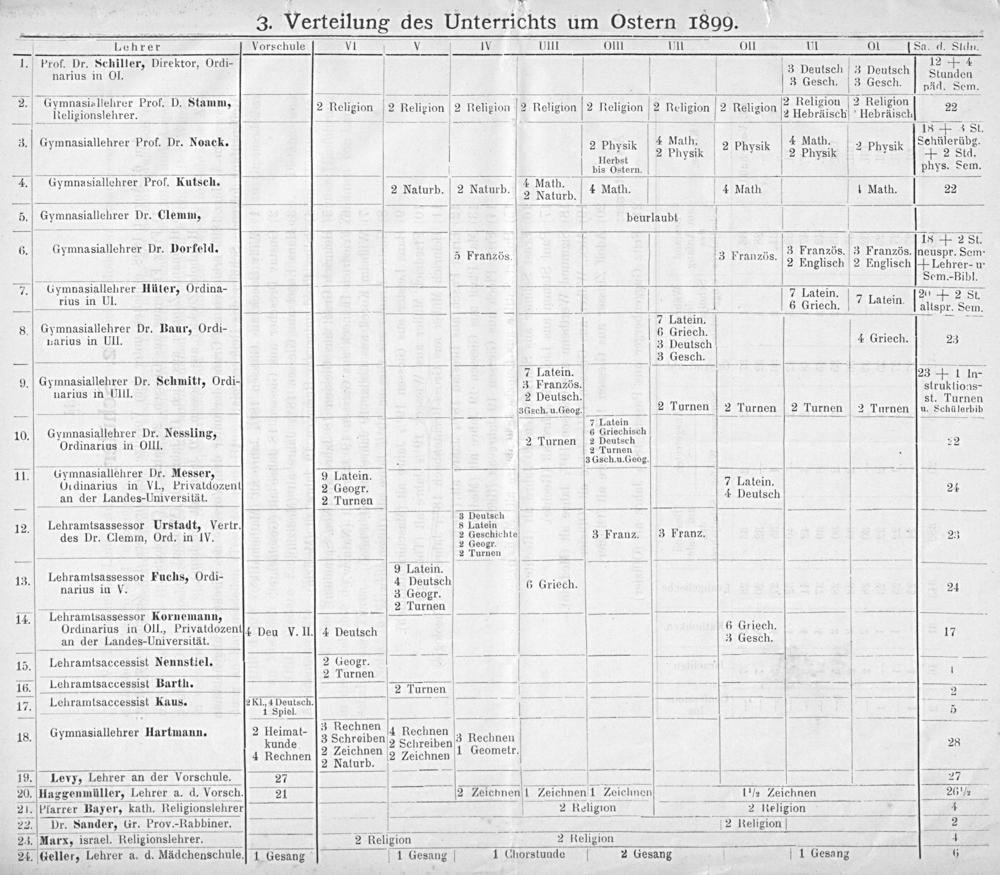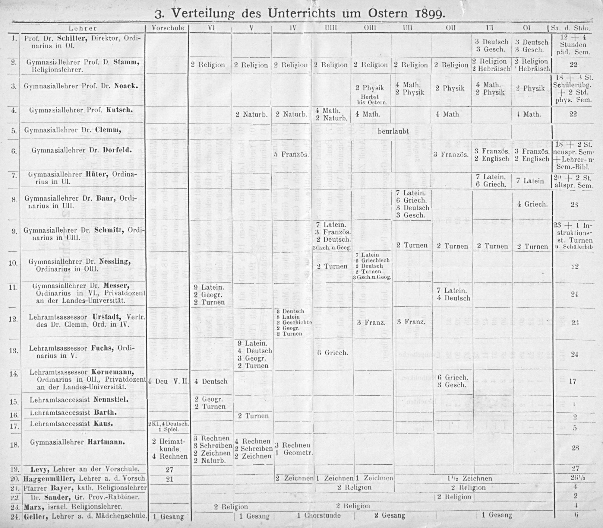 — Vorschule VI V IV UIII OII üI OII UI OI(Sa. d. Sieln. 1. Prof. Dr. Schiller, Direktor, Ordi- 12+4 narius in 0l. V b 3 Deutsch 3 Deutsch Wanflen 3 3 Gesch. 3 Gesch. näd. Sem V. Sem. 2. Gymnasiallehrer Prof. D. Stamm— 5. 2 Religion 2 Religionß lkeligionslehrer. 3 ² Releion 2 Reigeion 2 Reition 2 Relision 2 V 2 Religion 2 Religion 2 Religion 5 Hebrdisch 21aro, 22 G iallehrer Prof. Dr. Noack V V V V 3. Gymnasiallehrer Prof. Dr. Noack. V 2 physik 4 Malh. 4 Math.[Sehülerübg. nTa 2 Phrsi. 2 h'sik 2 phsik bTsi. †. 2 Sia⸗ — bis Ostern. I phys. Sem. 4. Gymnasiallchrer Prof. Kutsch. K„ 4 Math. 8 2 Naturb. 2 Naturb. 2 Naturb. 4 Math. 4 Math 1 Math. 22 5. Gymnasiallehrer Dr. Clemm, V peurlaubt 3 V ————— 1. „1. 18+† 2 8t. 6. Gymnasiallehrer Dr. Dorfeld. 3 Französ. 3 Französ 3 Französ. 3 Französ. ſneuspr. Sem- 8. 2 Englisch 2 Englisch ◻‿ Lehrer-u- ,(mnaslallchrer Hficre Oesias- Sem.-Bibl. 7. Gymnasiallehrer Hüter, Ordina————— 7 Iaem. 2 S Tllas.; 2 St. rius in UlI.—. V V V 6 Griech. V 7 Latein. jne Sem. 8. Gymnasiallehrer Dr. Baur, Ordi- V 3 Patein. narius in UII. 3 Peutsch 4 Griech. 23 Gesch. V— 9. Gymnasiallehrer Dr. Schmitt, Ordi- 7 PAtein 83. 1, l narius in UIII. 2 Deutsch. st. Turnen — 3Gsch. u. Geog. 2 Turnen 2 Turnen 2 Turnen 2 Turnen ſu. Schülerbib atein 10. Gymnasiallehrer Dr. Nessling, 5 Priechisch Ordinarius in Olll. 2 Turnen 2 Donteuh 22 — 3 Gsch. u. Geog. 11. G'ymnasiallehrer Dr. Messer, 9 Latein. Oedinarius in VI., Privatdozent 2 Geogr 7 Latein. 2½ 2 22. 4 4 an der Landes-Universität. 2 Turnen 4 Deutsch — Peutsch 12. Lehramtsassessor Urstadt, Vertr. 3 Latein des Dr. Clemm, Ord. in IV. 2 Geschichte 3 Franz. 3 Franz 23 2 Geogr. —— 1 2² Turnen. 4 142ſ . 9 Latein. . Lebramtsassessor Fuchs, Ordi- 13. narius in V 7 4 Deutsch 6 Griech. 24 3 3 Geogr. 2 — 2 Turnen 14. Lehramtsassessor Kornemann,——————— 3 4 den—— Ordinarius in Oll., Privatdozent; Deu V. II h z Griech. 7 an der Landes-Universität. i Deu V. UI 1 Deutsc 3 Gesch. 17 15. Lehramtsaccessist Nenustiel. 2 Geogr.—— eeeece Rari 2 Turnen 16. Lehramtsaccessist Barth. urnen 6———————— 17 Lehramtsaccessist Kaus. 2 KI. 4 Deutsch.———ͤͤͤ——— ——. 1 Spiel. 1 5 . Gymnasiallehrer Hartmann. 2 Heimat- 3 3 Rechnen 4 Rechnen den 18. kunde 3 Seheriden s Schreiben,3 Keelmen 28 4 Rechnen 2 aenen 2 Zeichnen Lome r. 19. Levy, Lehrer an der Vorschule. 27————— 27 20. Haggenmüller, Lehrer a. d. Vorsch. 21 2 Zeichnenl Zeichmen Zeichnen 112 Zeichnen 26 2 21. Pfarrer Bayer, kath. Religionslehrer 2 Religion 2 Religion 4 22. Dr. Sander, Gr. Prov.Rabbiner.. 2 Religion 2 3. Marx, israel. Religionslehrer. 2 KReligion 2 Religion 4 24. Geller, Lehrer a. d. Mädchenschule. 1 Gesang 1 Gesang 1 Chorstundc 2 Gesang 1 Gesang 6