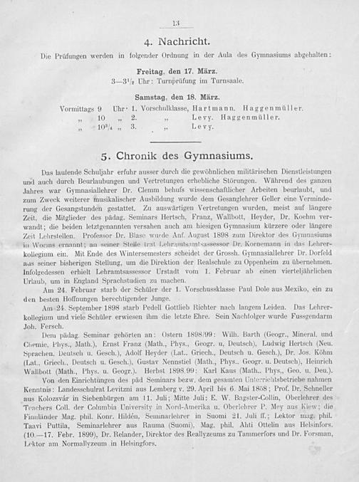 Von den Einrichtungen des päd Seminars bezw. dem gesamten Unterrichtsbetriebe nahmen Kenntnis: Landesschulrat Levitzni aus Lemberg v. 29. April bis 6. Mai 1808; Prof. Dr. Schneller aus Kolozsvär in Siebenbürgen am 11. Juli; Mitte Juli: E. W. Bagster-Collin, Oberlehrer des Teachers Coll. der Columbia University in Nord-Amerika u. Oberlehrer P. Mey aus Kiew; die Finuländer Mag. phil. Konr. Hildén, Seminarlehrer in Suomi 21. Juli ff.; Lektor mag. phil. Taavi Puttila, Seminarlehrer aus Rauma(Suomi). Mag. phil. Ahti Ottelin aus Helsinfors. (10.—17. Febr. 1899), Dr. Relander, Direktor des Reallyzeums zu Tammerfors und Dr. Forsman, Lektor am Normallvzeum in Helsingfors.