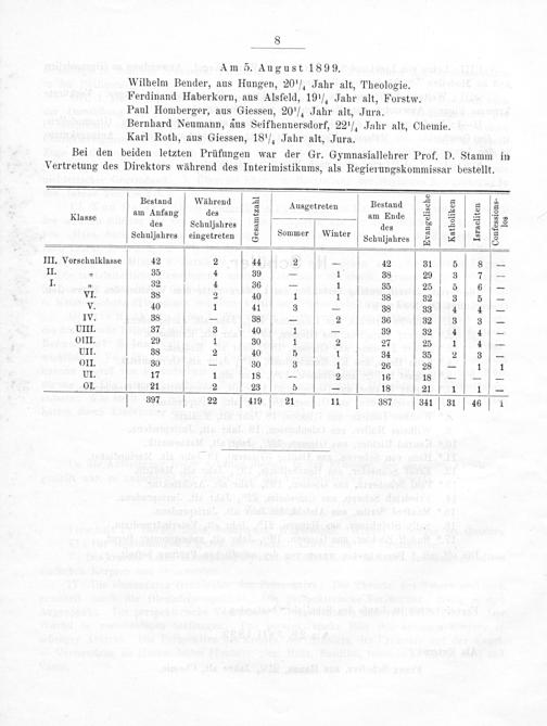 Wilhelm Bender, aus Hungen, 20 ⅓¼ Jahr alt, Theologie. Ferdinand Haberkorn, aus Alsfeld, 19 ¼ Jahr alt, Forstw. Paul Homberger, aus Giessen, 20 ¼ Jahr alt, Jura. Bernhard Neumann, äus Seifhennersdorf, 22 ¼ Jahr alt, Chemie. Karl Roth, aus Giessen, 18 ⅓ Jahr alt, Jura.