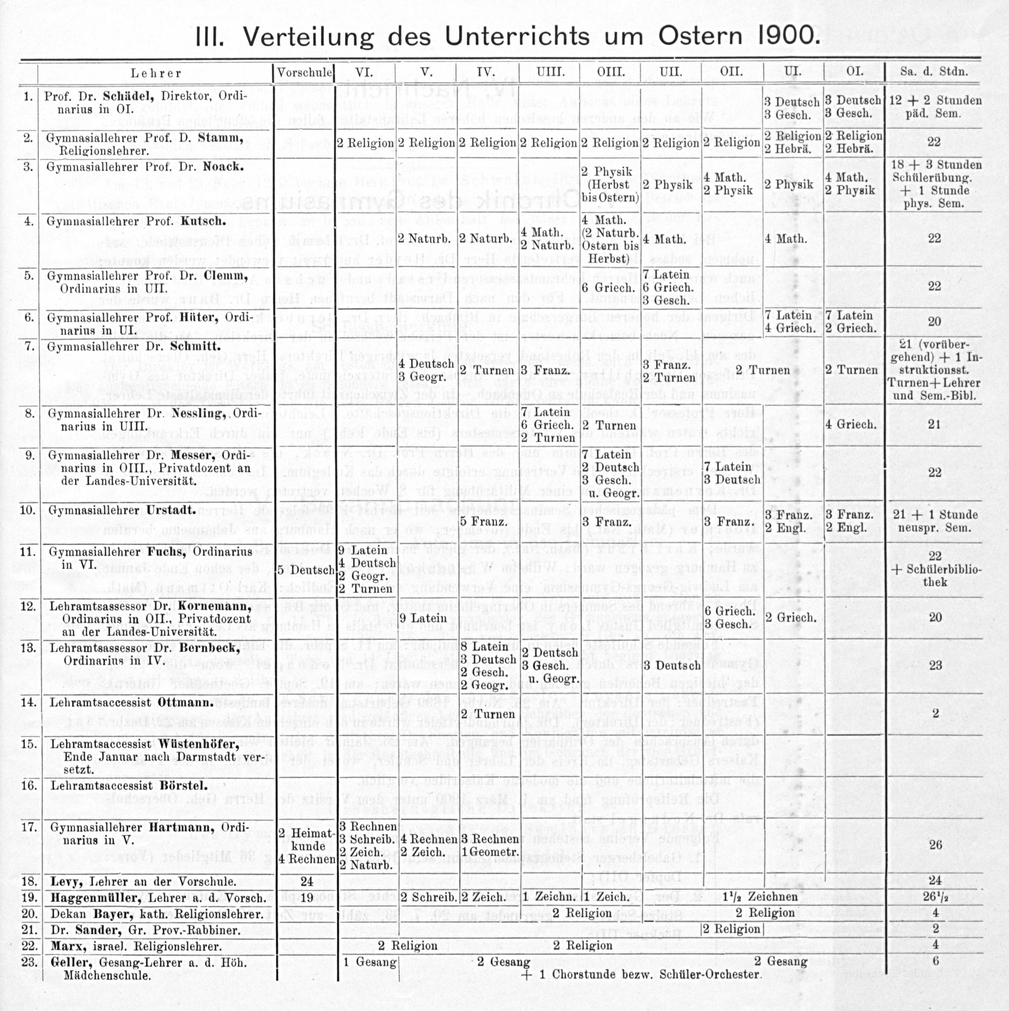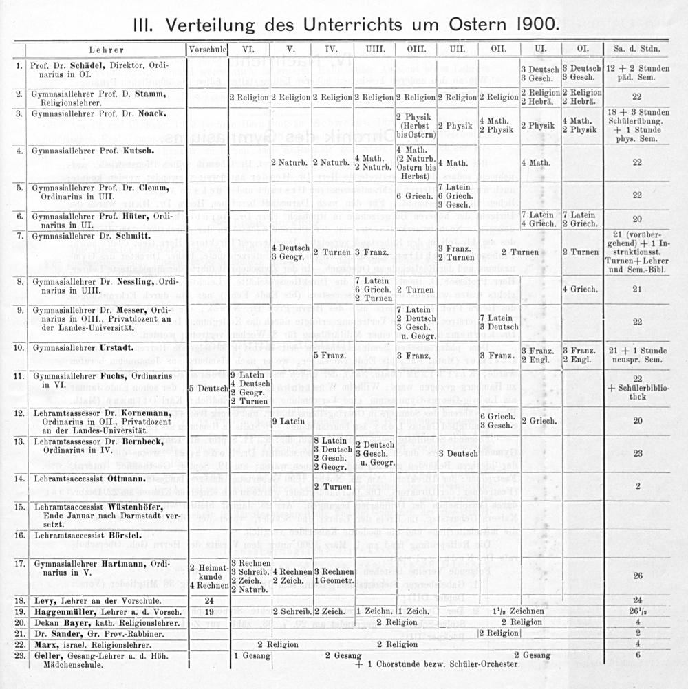 Lehrer Vorschuleſß VI. v. IVv. VIII. oOII. VUI. oI.. LUI.[I. I sa. d. Stdn. 1. Prof. Die dchiden: Direktor, Ordi- 3 Deutsch 3 Deutsch 12+ 2 Stunden narius in OI. 3 Gesch. 3 Gesch. päd. Sem. 2. 1 rer Prof. D. S.— ligion 2 Religi Lonhienalrſcwnt rof. D. Stamm, 2 Religion 2 Religion]2 Religionſ2 Religion 2 Religion]2 Religion2 Religion 2 Vegion 2 Heueion 22 3. Gymnasiallehrer Prof. Dr. Noack. 2 Physik 18+ 3 Stunden PSih 4 Math 4 Math. Schülerübun 2: 3;. d g. (Herbst 2 Physik 2 Physik ² Physik 2 Physik+ 1 Stunde bis Ostern) phys. Sem. 4. Gymnasiallehrer Prof. Kutsch. 4 4 Math. 5 ath.(2 Naturb. 2 Naturb. 2 Naturb. 2 Naturb. Ostern bis 4 Math. 4 Math. 22 Herbst) 5. Gymnasiallehrer Prof. Dr. Clemm, 7 Latein Ordinarius in UII. 6 Griech. 6 Griech. 22 3 Gesch. 6. Gymnasiallehrer Prof. Hüter, Ordi- 7 Latein 7 Latein 20 nnarius in UI. 4 Griech. 2 Griech. 7. Gymnasiallehrer Dr. Schmitt. 21(vorüber- gehend)+ 1 In- 4 Dentsth 2 Turnen 3 Franz. 2 LAtie 2 Turnen 2 Turnen struktionsst. gr. urnen Turnen+ Lehrer und Sem.-Bibl. 8. Gymnasiallehrer Dr. Nessling, Ordi- 7 Latein narius in UIII. 6 Griech. 2 Turnen 4 Griech. 21 2 Turnen 9. Gymnasiallehrer Dr. Messer, Ordi- 7 Latein narius in OIII., Privatdozent an 2 Deutsch 7 Latein 22 der Landes-Universität. 3 Gesch. 3 Deutsch u. Geogr. 10. Gymnasiallehrer Urstadt. 8 3 Franz. 3 Franz. 21+ 1 Stunde 5 Franz. 3 Franz. 3 Franz. 2 Engl. 2 Engl. neuspr. Sem. 11. Gymnasiallehrer Fuchs, Ordinarius 99 Latein 22 in VI. 5 Deutschſs heuarh+ Schülerbiblio- . 2 Turnen thek 12. Lehramtsassessor Dr. Kornemann, 6 Griech Ordinarius in OII., Privatdozent 9 Latein 3 Gesch. 2 Griech. 20 aan(er Landes-Universität. sen. 13. Lehramtsassessor Dr. Bernbeck, 8 Latein 2 Deutsch Ordinarius in IV. 3 Dektoth 3 Gesch. 3 Deutsch 23 2 Geogr. u. Geogr. 14. Lehramtsaccessist Ottmann.. 2 Turnen 2 15. Lehramtsaccessist Wüstenhöfer, Ende Januar nach Darmstadt ver- setzt. 16. Lehramtsaccessist Börstel. 17. Gymnasiallehrer Hartmann, Ordi-; 3 Rechnen narius in V.— 2 Heimat. 3 Schreib. 4 Rechnenſ3 Rechnen 26 4 Rech ne 2 Zeich. 2 Zeich. 1 Geometr. mnenſg Naturb. 18. Levy, Lehrer an der Vorschule. 24 24 19. Haggenmüller, Lehrer a. d. Vorsch. 19 2 Schreib. 2 Zeich. ſ1 Zeichn.[1 Zeich. 1 ½ Zeichnen 26 ½ 20. Dekan Bayer, kath. Religionslehrer. 2 Religion 2 Religion 4 21. Dr. Sander, Gr. Prov.-Rabbiner. 2 Religion 2 22. Marx, israel. Religionslehrer. 2 Religion 2 Religion 4 23. Geller, Gesang-Lehrer a. d. Höh. 1 Gesang 2 Gesang 2 Gesang 6 Mädchenschule.+ 1 Chorstunde bezw. Schüler-Orchester.