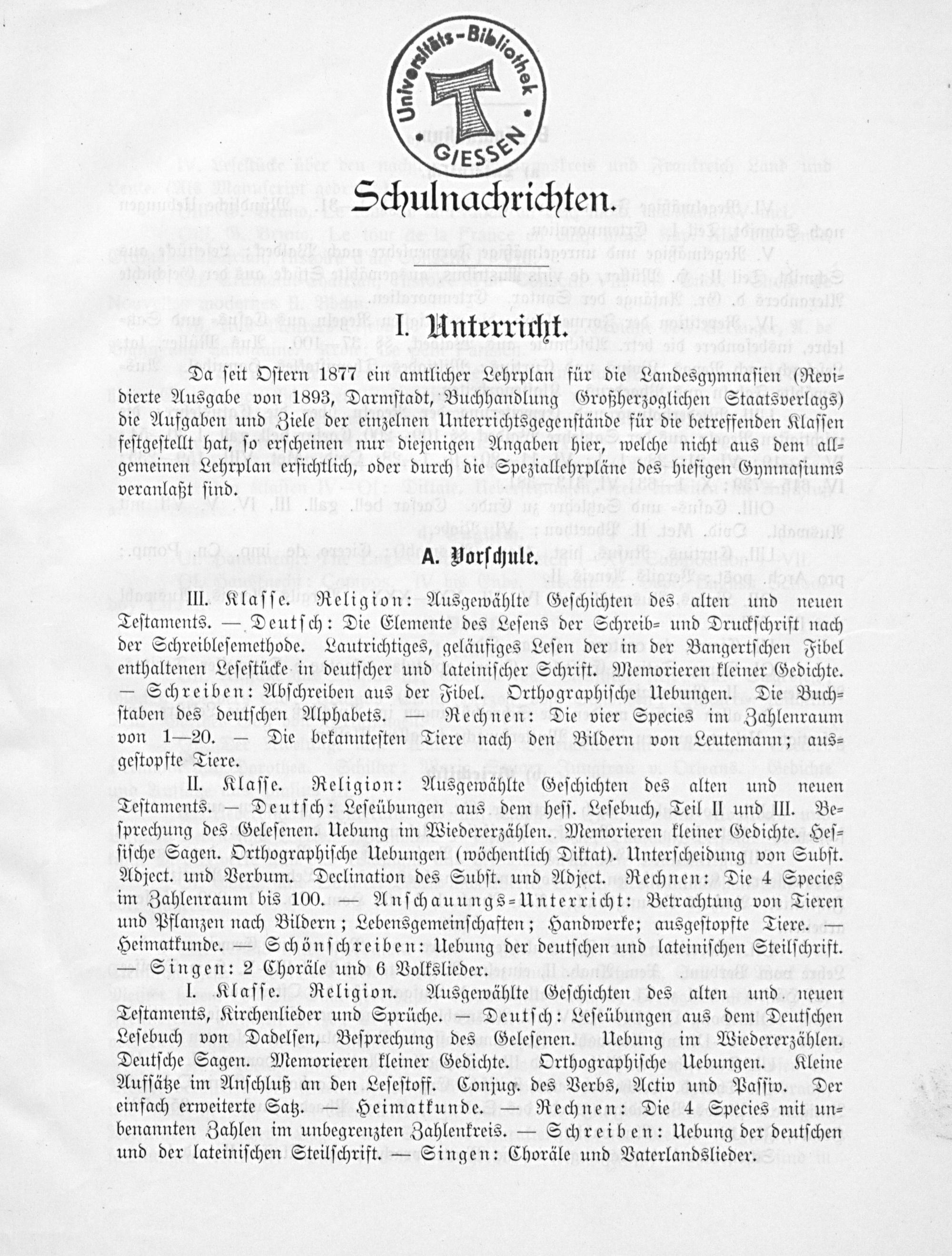 Da ſeit Oſtern 1877 ein amtlicher Lehrplan für die Landesgymnaſien(Revi⸗ dierte Ausgabe von 1893, Darmſtadt, Buchhandlung Großherzoglichen Staatsverlags) die Aufgaben und Ziele der einzelnen Unterrichtsgegenſtände für die betreffenden Klaſſen feſtgeſtellt hat, ſo erſcheinen nur diejenigen Angaben hier, welche nicht aus dem all⸗ gemeinen Lehrplan erſichtlich, oder durch die Speziallehrpläne des hieſigen Gymnaſiums veranlaßt ſind..