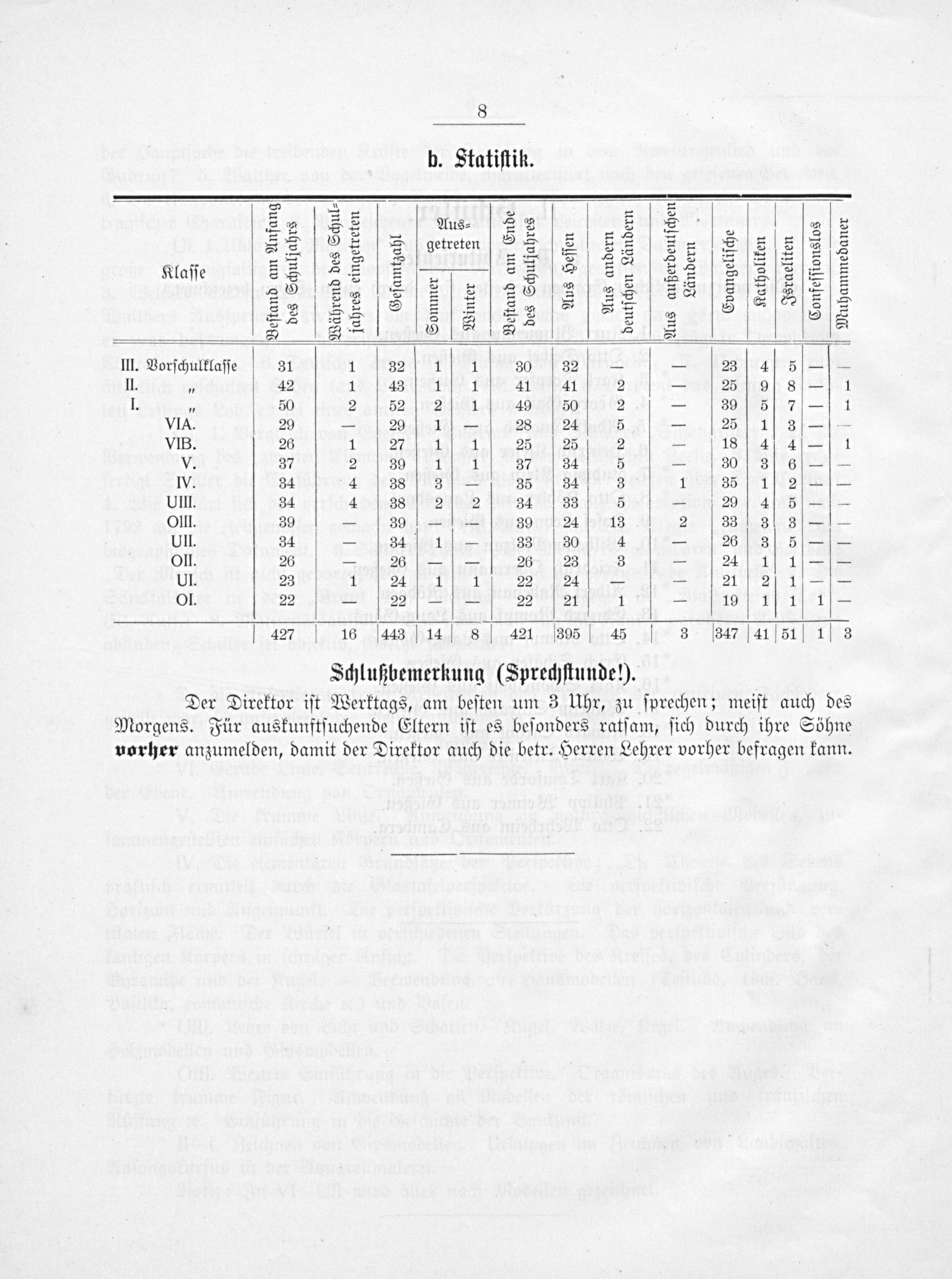 Der Direktor iſt Werktags, am beſten um 3 Uhr, zu ſprechen; meiſt auch des Morgens. Für auskunftſuchende Eltern iſt es beſonders ratſam, ſich durch ihre Söhne vorher anzumelden, damit der Direktor auch die betr. Herren Lehrer vorher befragen kann.