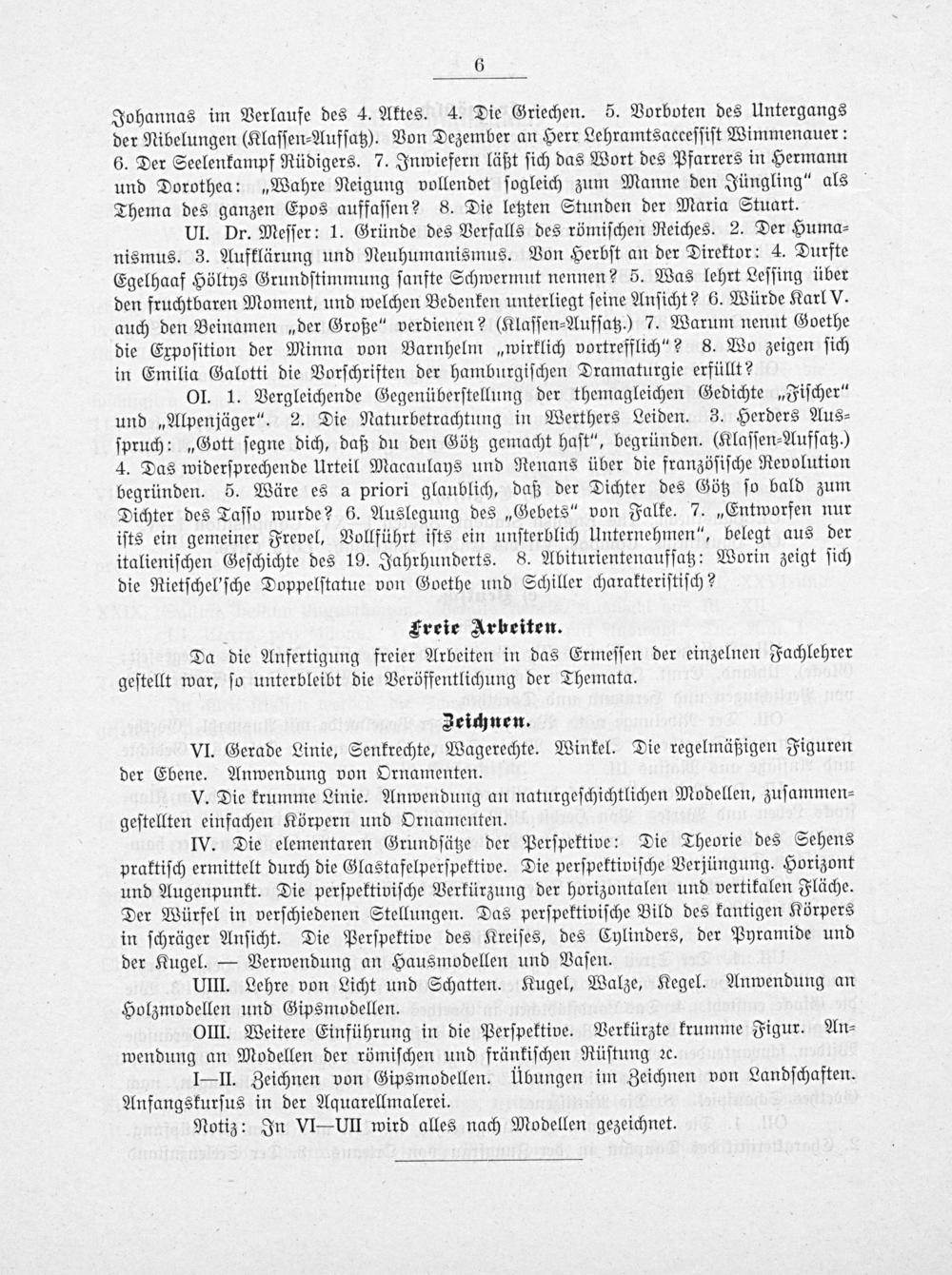 UI. Dr. Meſſer: 1. Gründe des Verfalls des römiſchen Reiches. 2. Der Huma⸗ nismus. 3. Aufklärung und Neuhumanismus. Von Herbſt an der Direktor: 4. Durfte Egelhaaf Höltys Grundſtimmung ſanfte Schwermut nennen? 5. Was lehrt Leſſing über den fruchtbaren Moment, und welchen Bedenken unterliegt ſeine Anſicht? 6. Würde Karl V. auch den Beinamen„der Große“ verdienen?(Klaſſen⸗Aufſatz.) 7. Warum nennt Goethe die Expoſition der Minna von Barnhelm„wirklich vortrefflich“? 8. Wo zeigen ſich in Emilia Galotti die Vorſchriften der hamburgiſchen Dramaturgie erfüllt?