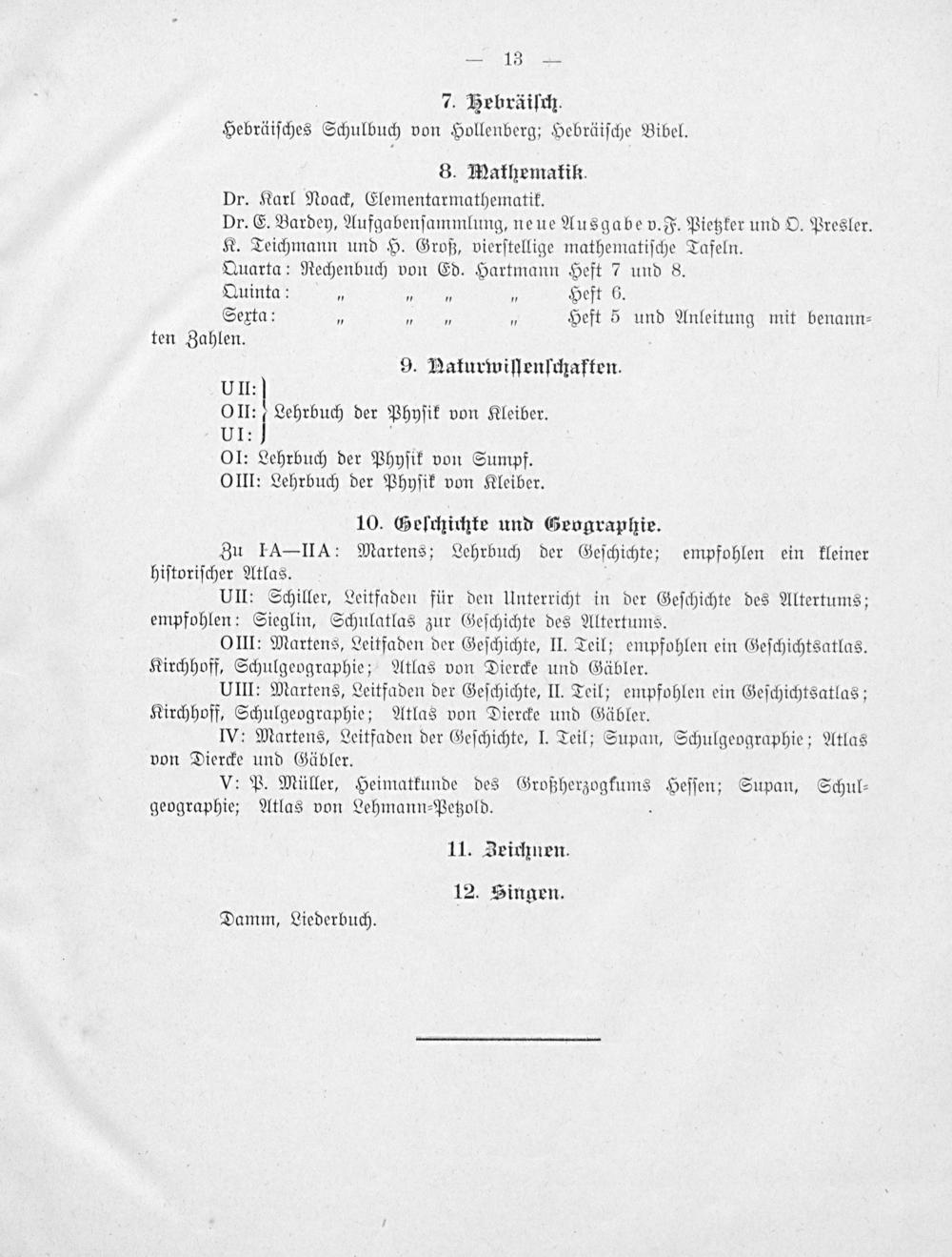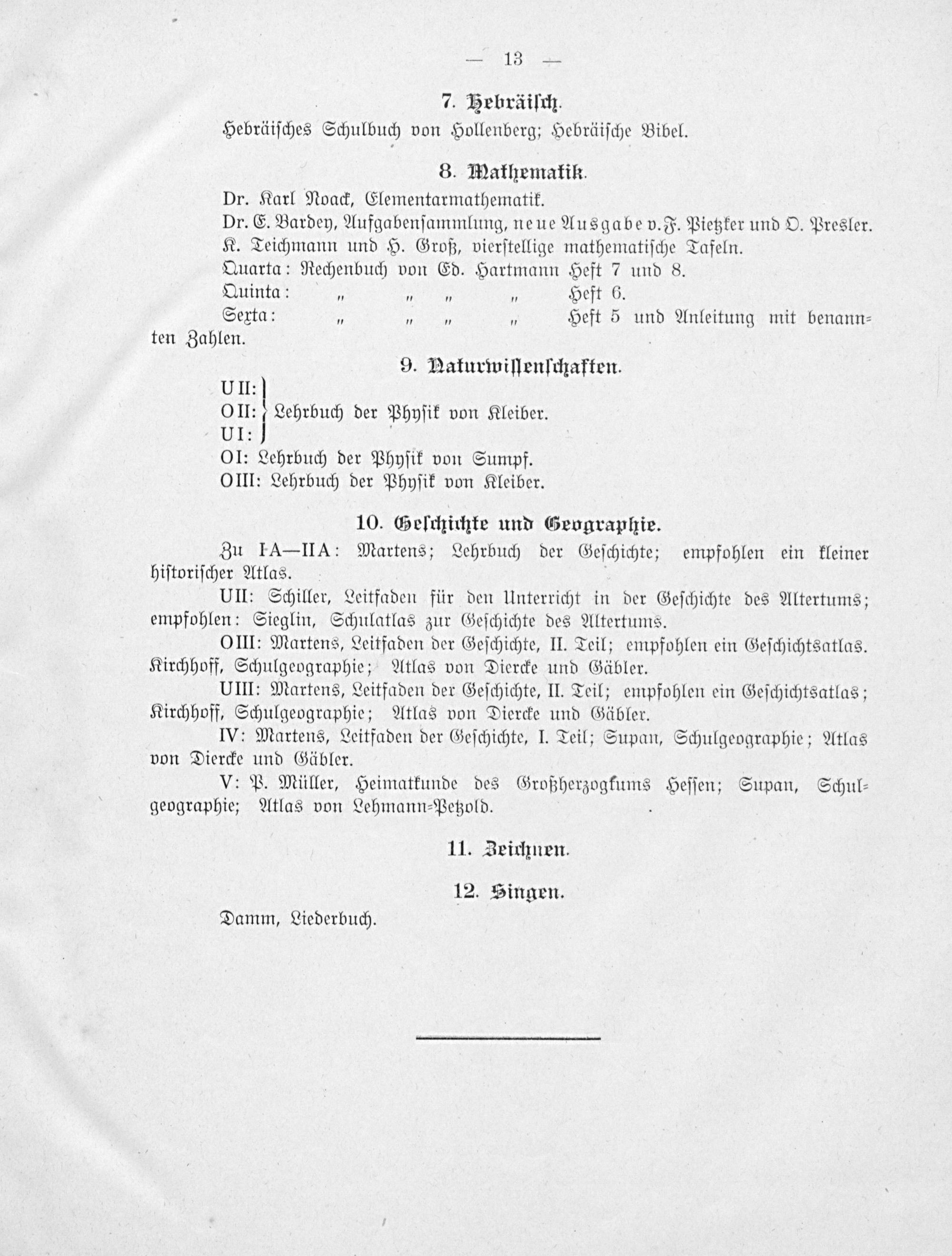 UIII: Martens, Leitfaden der Geſchichte, II. Teil; empfohlen ein Geſchichtsatlas; Kirchhoff, Schulgeographie; Atlas von Diercke und Gäbler.