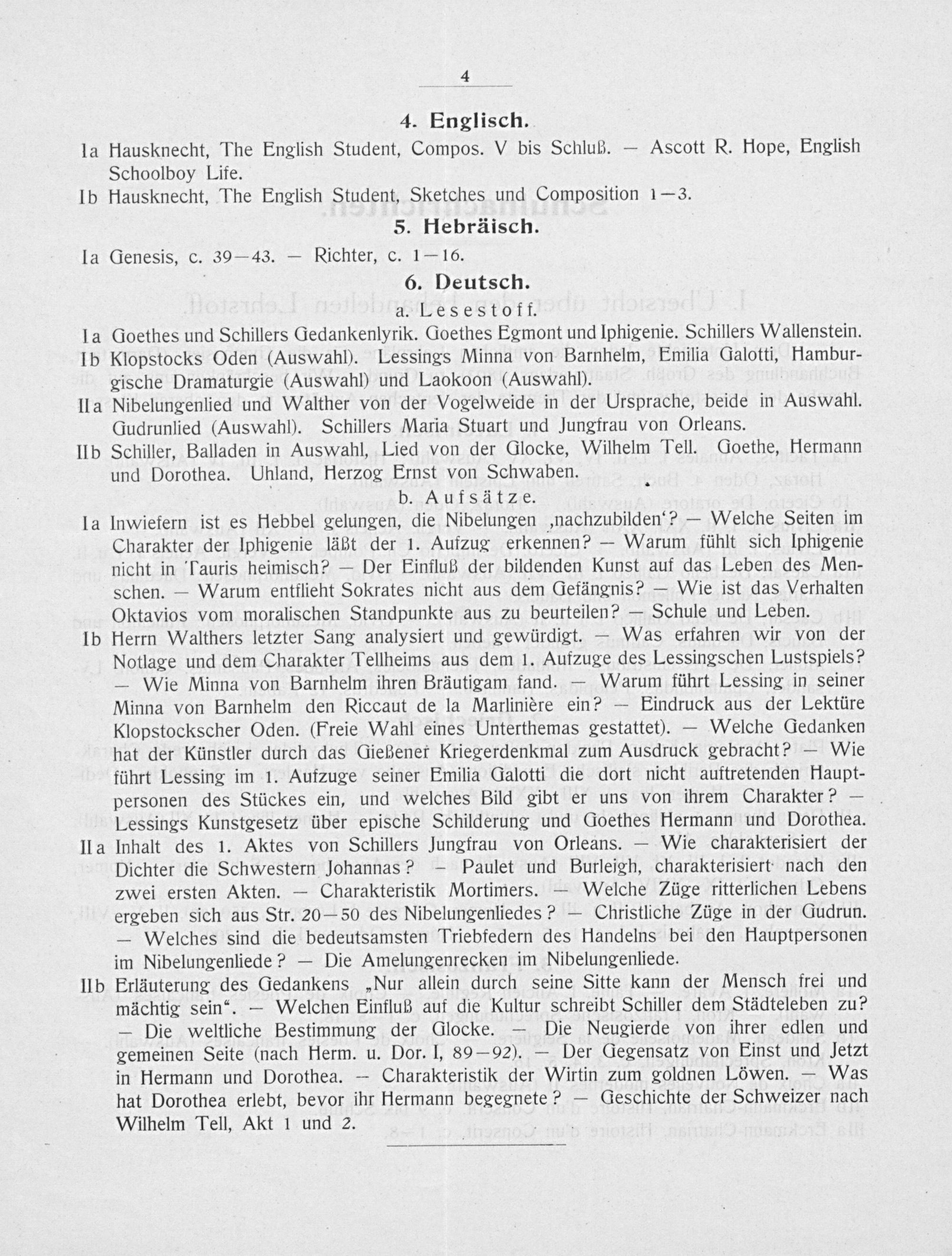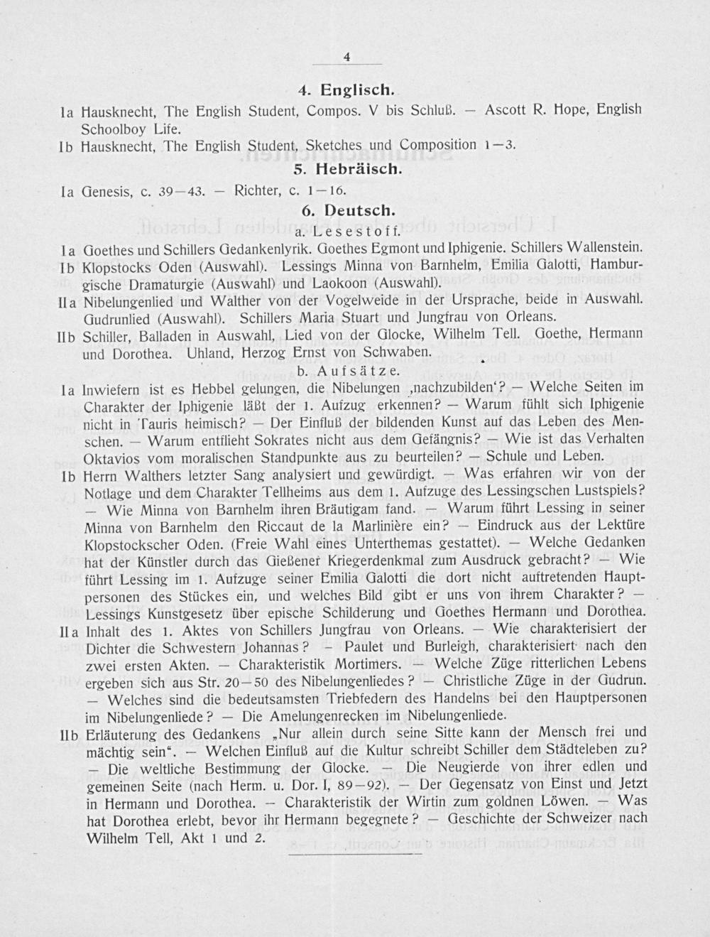 4. Englisch. Hausknecht, The English Student, Compos. V bis Schluß.— Ascott R. Hope, English Schoolboy Life. Hausknecht, The English Student, Sketches und Composition 1—3.