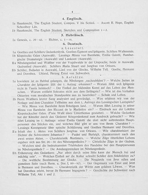 Herrn Walthers letzter Sang analysiert und gewürdigt.— Was erfahren wir von der Notlage und dem Charakter Tellheims aus dem 1. Aufzuge des Lessingschen Lustspiels? — Wie Minna von Barnhelm ihren Bräutigam fand.— Warum führt Lessing in seiner Minna von Barnhelm den Riccaut de la Marlinière ein?— Eindruck aus der Lektüre Klopstockscher Oden.(Freie Wahl eines Unterthemas gestattet).— Welche Gedanken hat der Künstler durch das Gießenef Kriegerdenkmal zum Ausdruck gebracht?— Wie führt Lessing im 1. Aufzuge seiner Emilia Galotti die dort nicht auftretenden faupt- personen des Stückes ein, und welches Bild gibt er uns von ihrem Charakter?— Lessings Kunstgesetz über epische Schilderung und Goethes Hlermann und Dorothea.