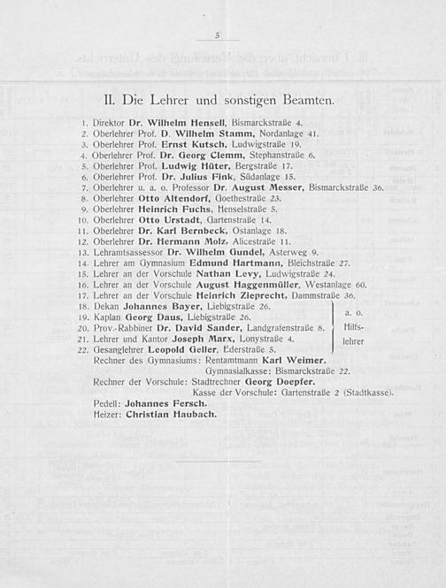 . Lehrer an der Vorschule August Haggenmüller, Westanlage 60. . Lehrer an der Vorschule Heinrich Zieprecht, Dammstraße 30. Dekan Johannes Bayer, Liebigstraße 20. . Kaplan Georg Daus, Liebigstraße 20. .Prov.-Rabbiner Dr. David Sander, Landgrafenstraße 8. Hilfs-