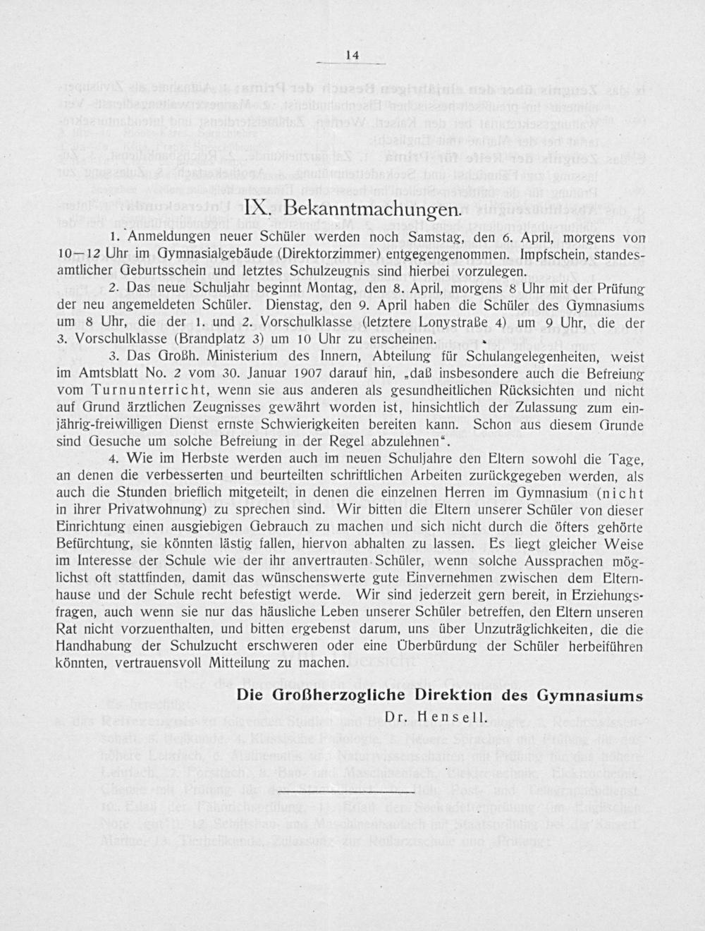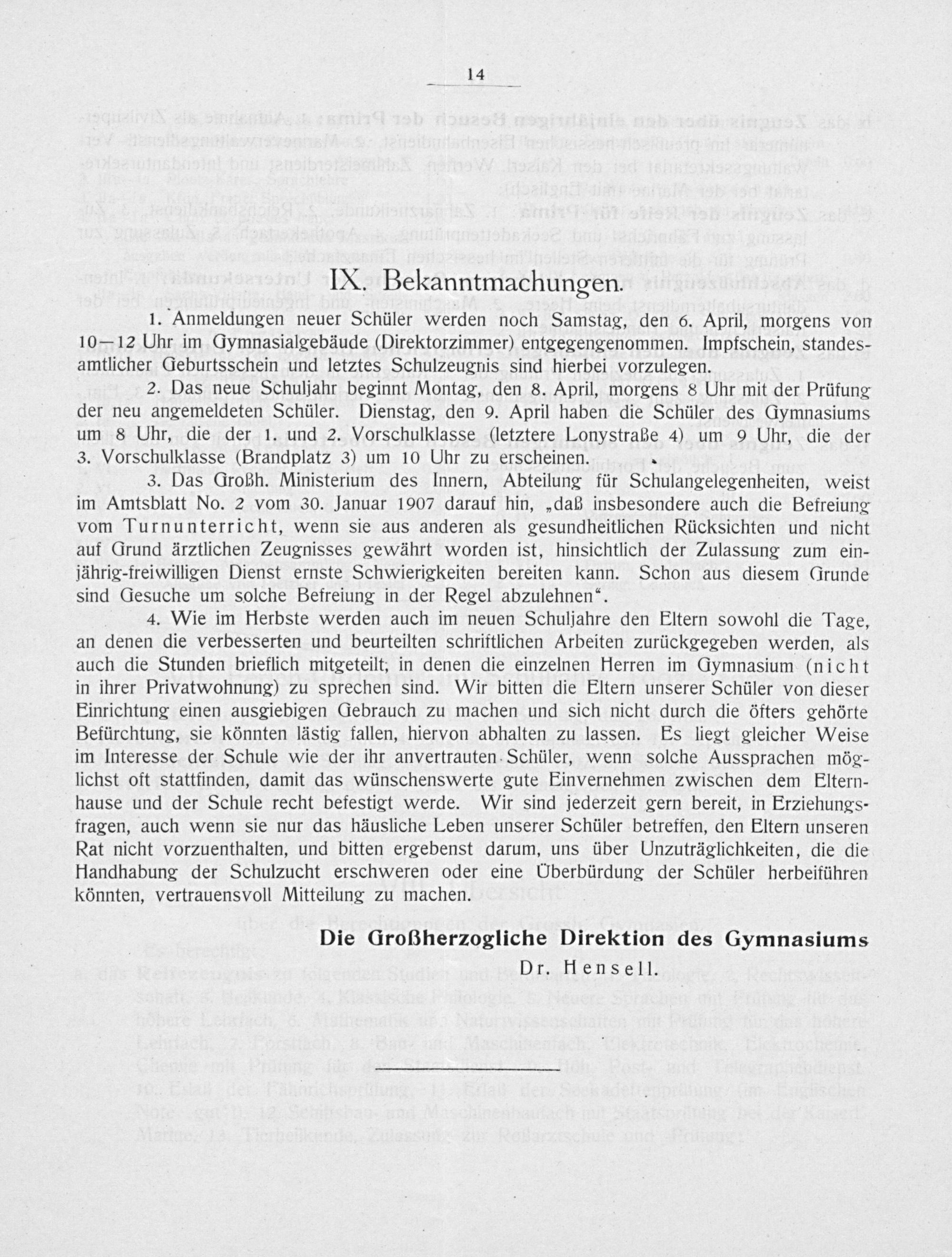 Die Großherzogliche Direktion des Gymnasiums Dr. Hensell.