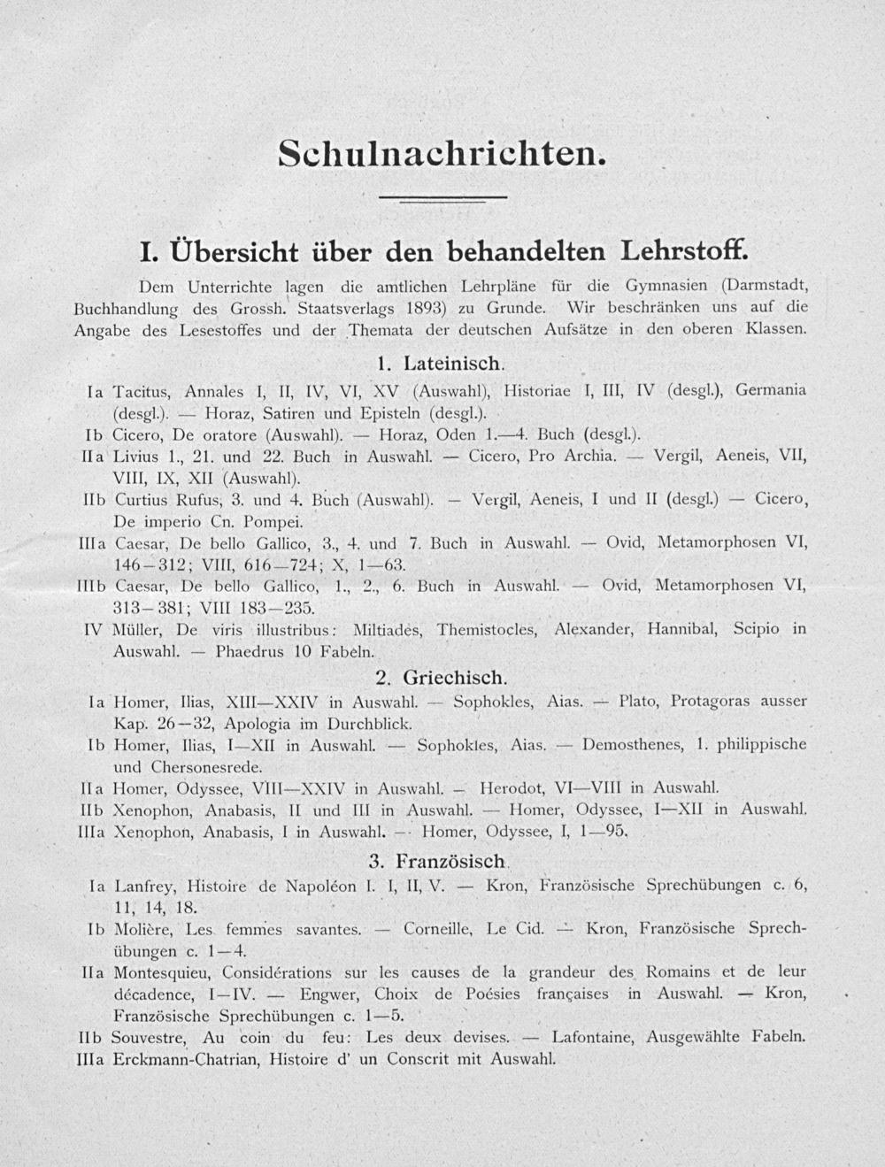 1. Lateinisch. Tacitus, Annales I, II, IV, VI, XV(Auswahl), Historiae I, III, IV(desgl.), Germania (desgl.).— Horaz, Satiren und Episteln(desgl.). Cicero, De oratore(Auswahl).— Horaz, Oden 1.— 4. Buch(desgl.). Livius 1., 21. und 22. Buch in Auswahl.— Cicero, Pro Archia.— Vergil, Aeneis, VII, VIII, IX, XII(Auswahl). Curtius Rufus, 3. und 4. Buch(Auswahl).— Vergil, Aeneis, I und II(desgl.)— Cicero, De imperio Cn. Pompei. Caesar, De bello Gallico, 3., 4. und 7. Buch in Auswahl.— Ovid, Metamorphosen VI, 146— 312; VIII, 616— 724; X, 1— 63. Caesar, De bello Gallico, 1., 2., 6. Buch in Auswahl.— Ovid, Metamorphosen VI, 313— 381; VIII 183— 235. Müller, De viris illustribus: Niltiadées, Themistocles, Alexander, Hannibal, Scipio in Auswahl.— Phaedrus 10 Fabeln.