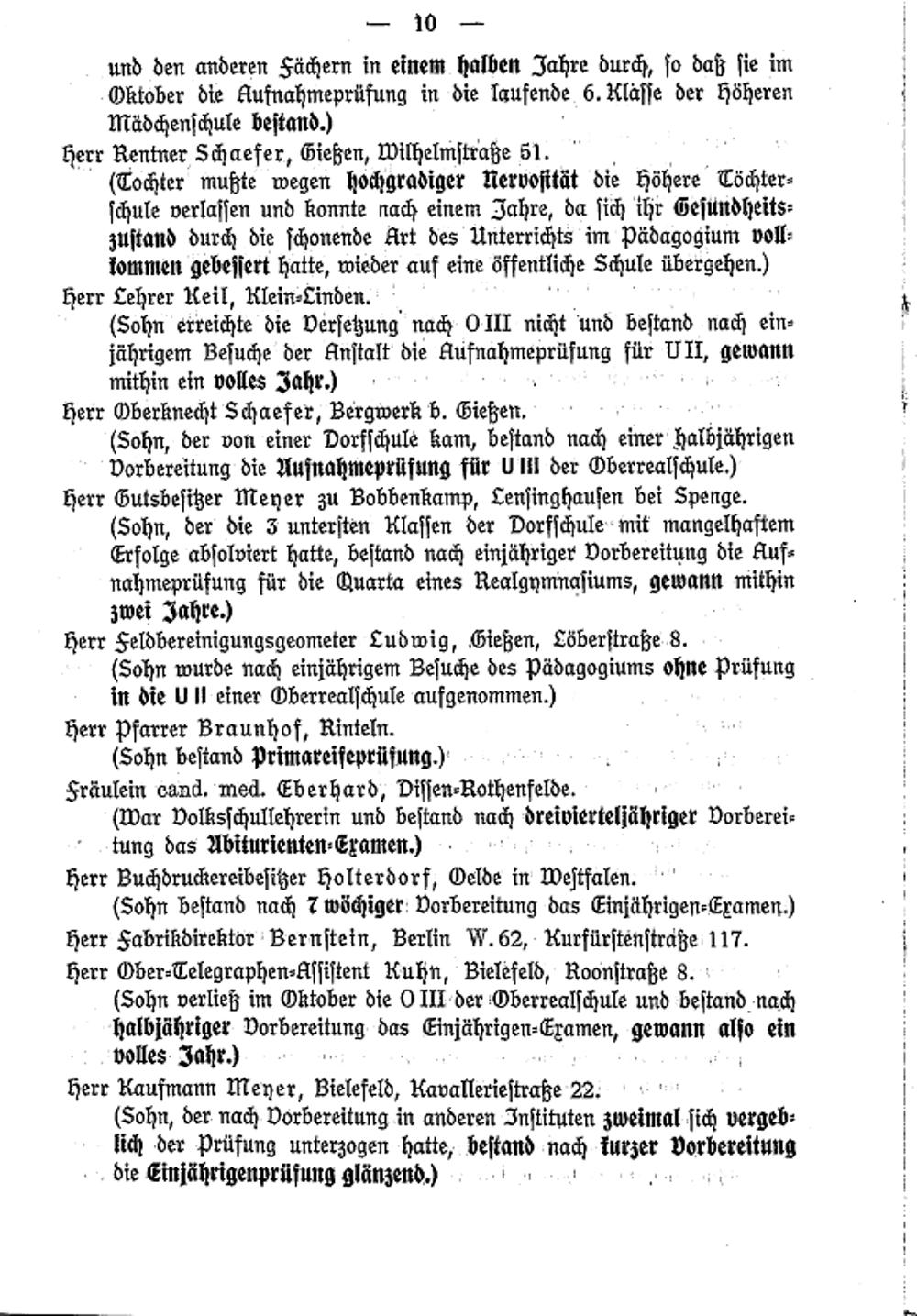 eerr Rentner Schaefer, Gießen, Wilhelmſbrage 51. (Cochter mußte wegen hochgraiger Rervoſität die Hähere Cöchter⸗ ſchule verlaſſen und konnte nach einem Jahre, da ſich ihr Gelundheit zuſtand durch die ſchonende Krt des Unterrichts im Pädagogium vat kommen gebeſſert hatte, wieder auf eine öffentüiche Schule übergehen)