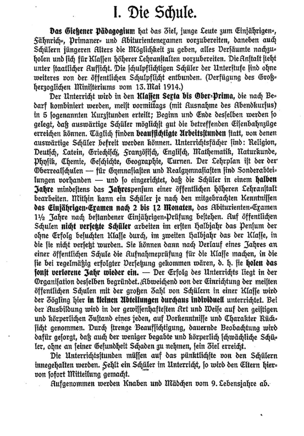 das Gießſener pädagogium hat das Fiel, junge Ceute zum Einjährigen⸗, Sähnrich⸗, Primaner⸗ und Abiturientenexamen vorzubereiten, daneben auch Schülern jüngeren Alters die Nöglichkeit zu geben, alles Verſüumte nachzu⸗ bolen und ſich für Klaſſen höherer Cehranſtalten vorzubereiten. Diegnſtalt ſleht unter ſtaatlicher Kufſicht. Die ſchulpflichtigen Schüler der Unterſtufe ſind ohne weiteres von der offentlichen Schulpflicht entbunden. erfügung des Groß⸗ herzoglichen Niniſteriums vom 13. Mai 1914.)