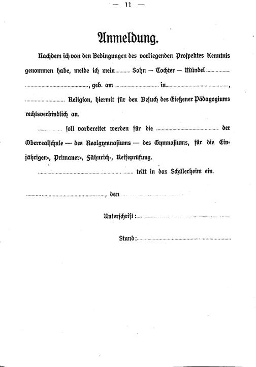 nachdem ich von den Bedingungen des vorliegenden Proſpektes Kenntnis genommen habe, melde ich mein... Sohn— Cochter— Mündel.-- „geb. am in.-. Religoon, hiermit für den Beſuch des Eieener Pädagogiums rechtsverbindlich an. ſoll vorbereitet werden für die 4 der Oberrealſchule— des Realgymnaſtums— des Gummaſtums, für die Ein.