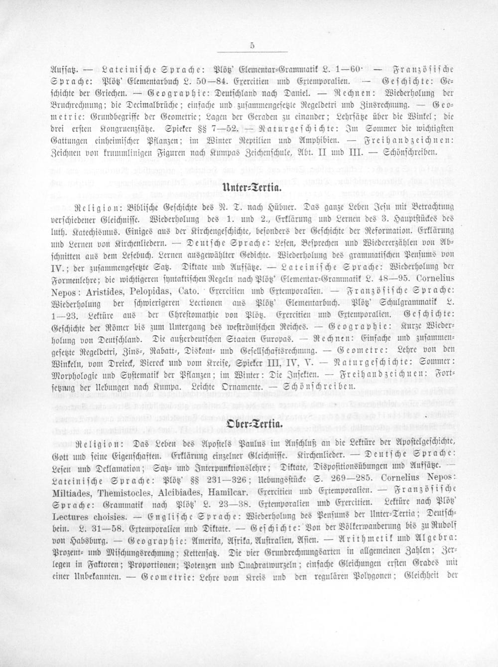 Religion: Das Leben des Apoſtels Paulus im Anſchluß an die Lektüre der Apoſtelgeſchichte, Gott und ſeine Eigenſchaften. Erklärung einzelner Gleichniſſe. Kirchenlieder.— Deutſche Sprache: Leſen und Deklamation; Satz⸗ und Interpunktionslehre; Diktate, Dispoſitionsübungen und Aufſätze.— Lateiniſche Sprache: Plötz;§§ 231—326; Uebungsſtücke S. 269— 285. Cornelius Nepos: Miltiades, Themistocles. Alcibiades, Hamilcar. Exercitien und Extemporalien.— Fr anzöſiſche Sprache: Grammatik nach Plötz; L. 23—38. Ertemporalien und Exercitien. Lektüre nach Plötz Lectures choisies.— Engliſche Sprache: Wiederholung des Penſums der Unter⸗Tertia; Deutſch⸗ bein. L. 31— 58. Ertemporalien und Diktate.— Geſchichte: Von der Völkerwanderung bis zu Rudolf von Habsburg.— Geographie: Amerika, Afrika, Auſtralien, Aſien.— Arithmetik und Algebra: Prozent⸗ und Miſchungsrechnung; Kettenſatz. Die vier Grundrechnungsarten in allgemeinen Zahlen; Zer⸗ legen in Faktoren; Proportionen; Potenzen und Quadratwurzeln; einfache Gleichungen erſten Grades mit einer Unbekannten.— Geometrie: Lehre vom Kreis und den regulären Polygonen; Gleichheit der