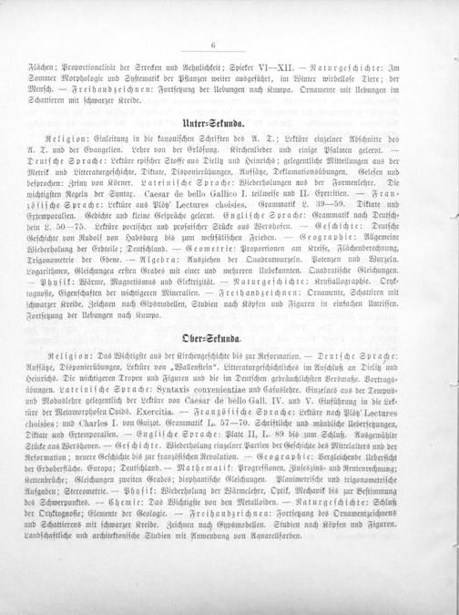 Religion: Das Wichtigſte aus der Kirchengeſchichte bis zur Reformation.— Deutſche Sprach e: Aufſätze, Disponierübungen, Lektüre von„Wallenſtein“. Litteraturgeſchichtliches im Anſchluß an Dielitz und Heinrichs. Die wichtigeren Tropen und Figuren und die im Deutſchen gebräuchlichſten Versmaße. Vortrags⸗ übungen. Lateiniſche Sprache: Syntaxis convenientiae und Caſuslehre. Einzelnes aus der Tempus⸗ und Moduslehre gelegentlich der Lektüre von Caesar de bello Gall. IV. und V. Einführung in die Lek⸗ türe der Metamorphoſen Ovids. Exercitia.— Franzöſiſche Sprache: Lektüre nach Plötz Lectures choisies; und Charles I. von Guizot. Grammatik L. 57— 70. Schriftliche und mündliche Ueberſetzungen, Diktate und Ertemporalien.— Engliſche Sprache: Plate II, L. 89 bis zum Schluß. Ausgewählte Stücke aus Wershoven.— Geſchichte. Wiederholung einzelner Partien der Geſchichte des Mittelalters und der Reformation; neuere Geſchichte bis zur franzöſiſchen Revolution.— Geographie: Vexrgleichende Ueberſicht der Erdoberfläche. Europa; Deutſchland.— Mathematik: Progreſſionen, Zinſeszins⸗ und Rentenrechnung; Kettenbrüche; Gleichungen zweiten Grades; diophantiſche Gleichungen. Planimetriſche und trigonometriſche Aufgaben; Stereometrie.— Phyſik: Wiederholung der Wärmelehre, Optik, Mechanik bis zur Beſtimmung des Schwerpunktes.— Chemie: Das Wichtigſte von den Metalloiden.— Naturgeſchichte: Schluß der Oryktognoſie; Elemente der Geologie.— Freihandzeichnen: Fortſetzung des Ornamentzeichnens und Schattierens mit ſchwarzer Kreide. Zeichnen nach Gypsmodellen. Studien nach Köpfen und Figuren. Landſchaftliche und architektoniſche Studien mit Anwendung von Aauarellfarben.